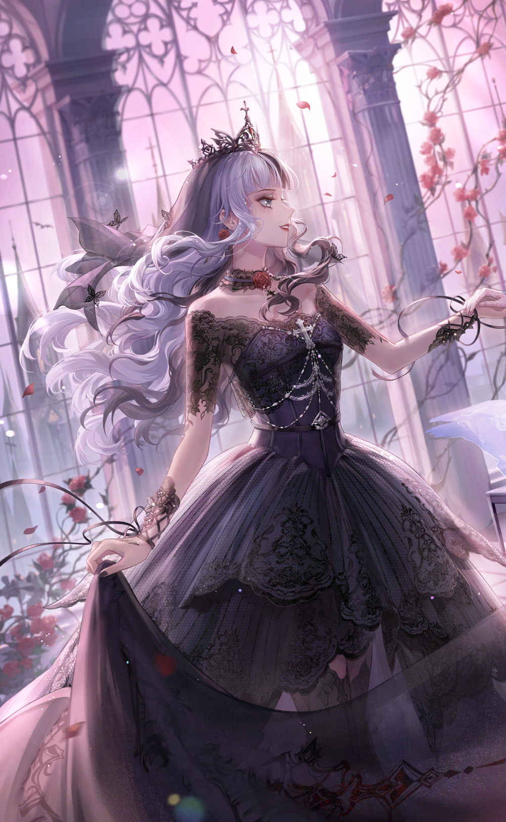 1girl arm_warmers artist_request bare_shoulders black_arm_warmers black_choker black_dress black_hair black_nails black_ribbon black_shirt black_tiara black_veil bride castle choker church cowboy_shot cross cross-laced_armwear day dress drunken_rose_(shining_nikki) earrings eyeshadow floral_print flower flower_earrings game_cg gothic_lolita grey_eyes grey_eyeshadow grey_thighhighs hand_on_another's_hand happy highres holding_own_dress indoors jewelry lace lace-trimmed_thighhighs lace_arm_warmers lace_choker lace_shirt lace_trim light_particles lipstick lolita_fashion long_dress looking_to_the_side makeup multicolored_hair nail_polish neck_flower neck_ribbon night_witch_(shining_nikki) nikki_(series) off-shoulder_shirt off_shoulder official_art open_mouth outstretched_arm petals pillar pink_sky red_flower red_lips red_rose ribbon rose rose_petals shining_nikki shirt shirt_under_dress short_sleeves sidelocks sky smile solo_focus split-color_hair sun sunrise table teeth thighhighs thorns tiara tile_floor tiles train_(clothing) two-tone_hair veil wavy_hair wedding_dress white_hair window wrist_ribbon
