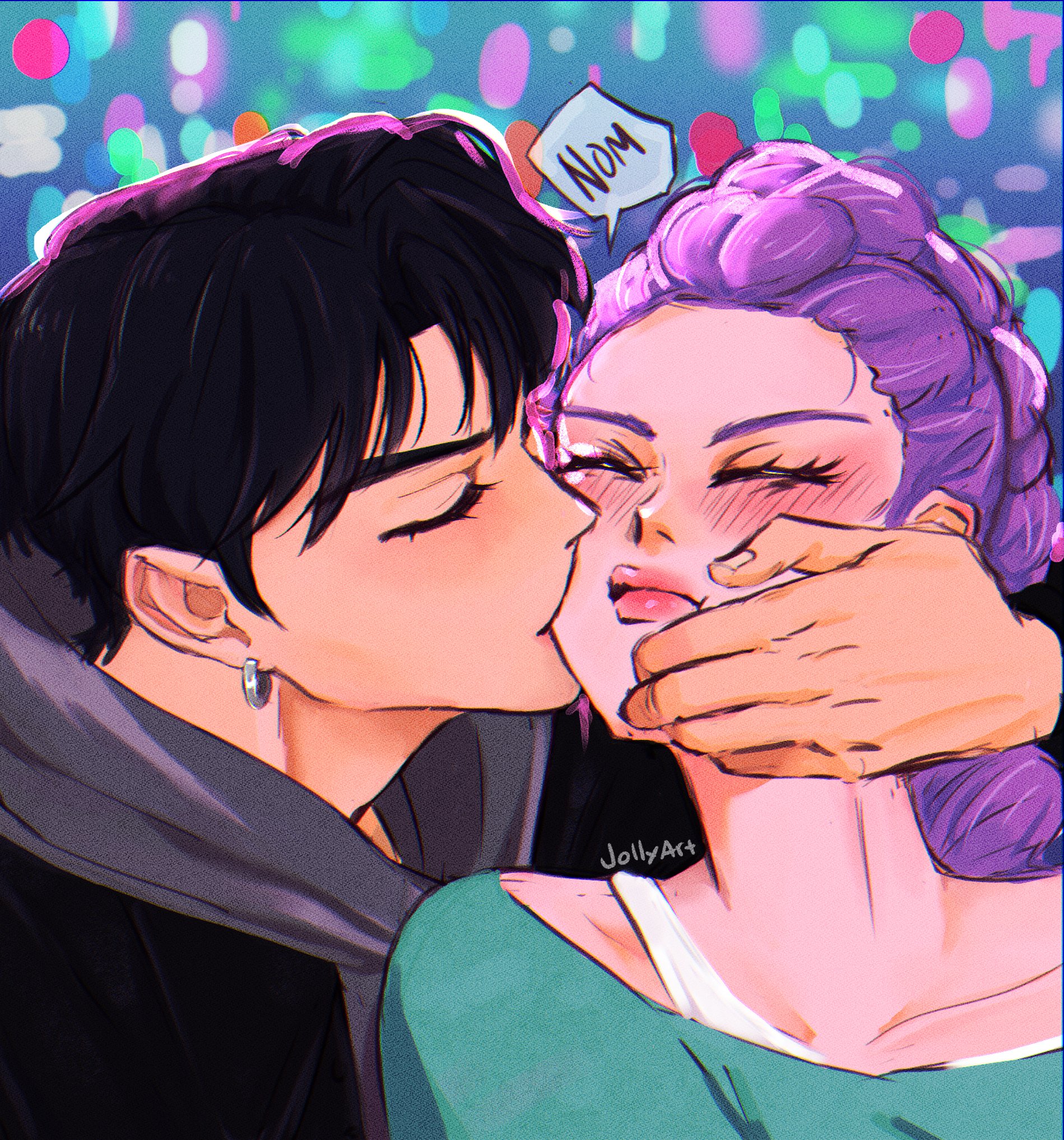 1boy 1girl artist_name black_hair black_jacket blush braid braided_ponytail closed_eyes commentary earrings english_commentary eyelashes highres hood hoodie jacket jewelry jinu_(kpop_demon_hunters) jolly_(jollyfarts) kiss kpop_demon_hunters pink_lips purple_hair rumi_(kpop_demon_hunters) short_hair upper_body