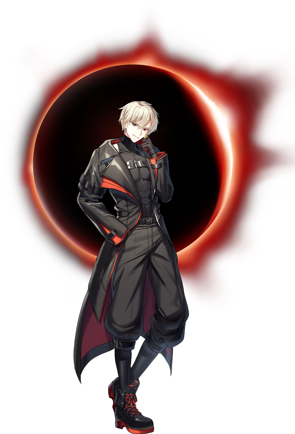 1boy black_boots black_coat black_pants black_shirt boots closers coat covered_abs covered_pectorals full_body grin hand_on_own_hip highres looking_at_viewer male_focus official_art open_clothes open_coat pants pectorals red_eyes shirt short_hair simple_background smile solo standing white_background white_hair wolfgang_schneider