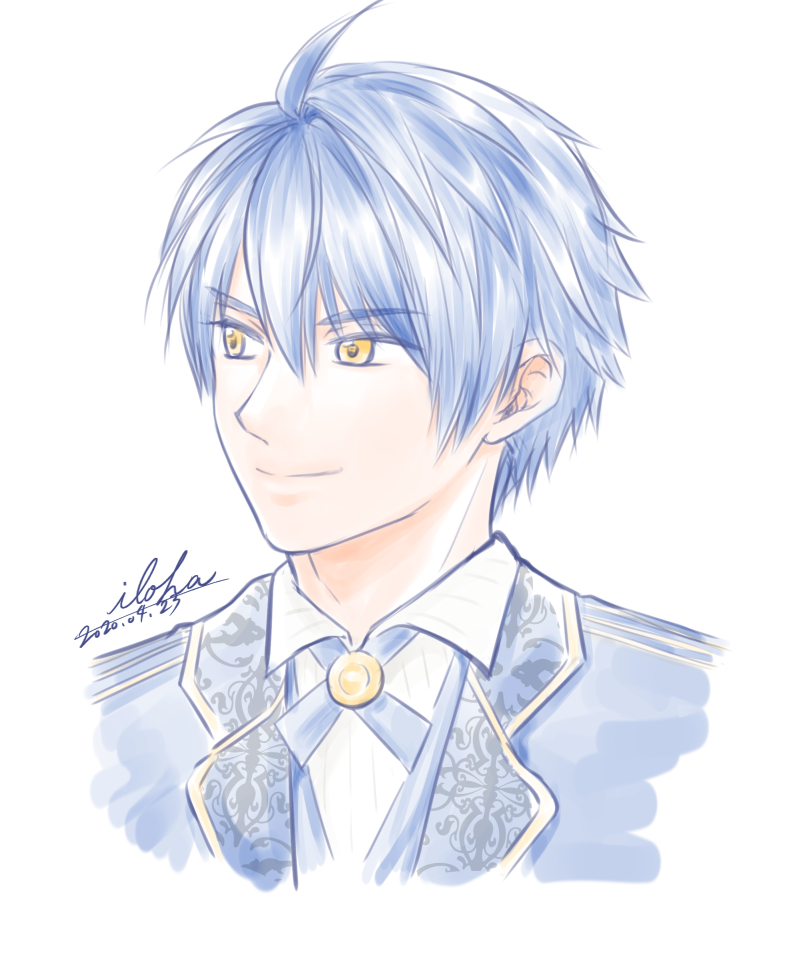 1boy ahoge akuyaku_reijou_wa_ringoku_no_outaishi_ni_dekiai_sareru aquasteed_marinforest blue_hair bolo_tie dated hair_between_eyes male_focus portrait short_hair simple_background smile solo touma_katsuragi white_background yellow_eyes