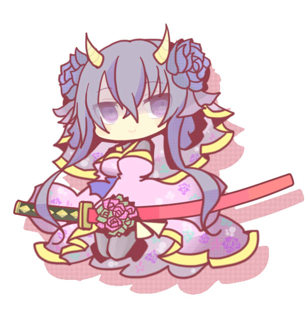 1girl black_hair black_pantyhose breasts chibi emil_chronicle_online empty_eyes flower hair_flower hair_ornament homurabi izanami_(eco) japanese_clothes katana kimono large_breasts long_hair pantyhose purple_eyes sword weapon white_background