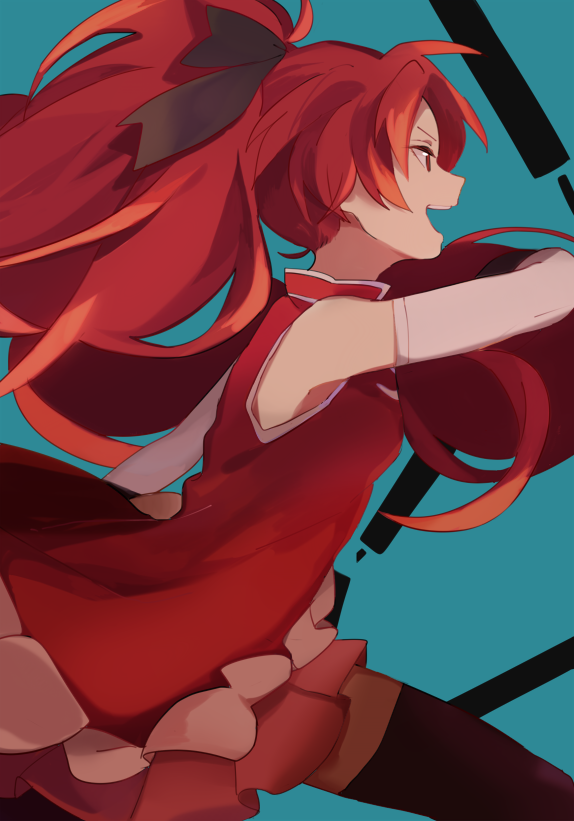 1girl bare_shoulders black_bow black_thighhighs bow commentary dress elbow_gloves english_commentary floating_hair frilled_dress frills from_side gloves hair_bow high_ponytail magical_girl mahou_shoujo_madoka_magica open_mouth pararade ponytail profile red_dress red_eyes red_hair sakura_kyoko sakura_kyoko_(magical_girl) sleeveless sleeveless_dress solo teeth thighhighs upper_teeth_only weapon