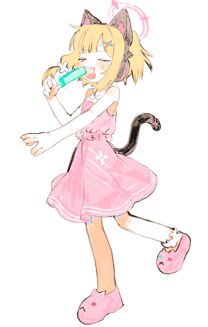 1girl animal_ear_headphones animal_ears blonde_hair blue_archive cat_ear_headphones cat_ears cat_tail dress fake_animal_ears fang food full_body hair_ornament halo headphones holding holding_food holding_popsicle low_twintails momoi_(blue_archive) one_eye_closed open_mouth pink_dress pink_eyes pink_halo popsicle shinbashi_seiji short_hair simple_background sleeveless sleeveless_dress solo standing standing_on_one_leg tail twintails white_background x_hair_ornament
