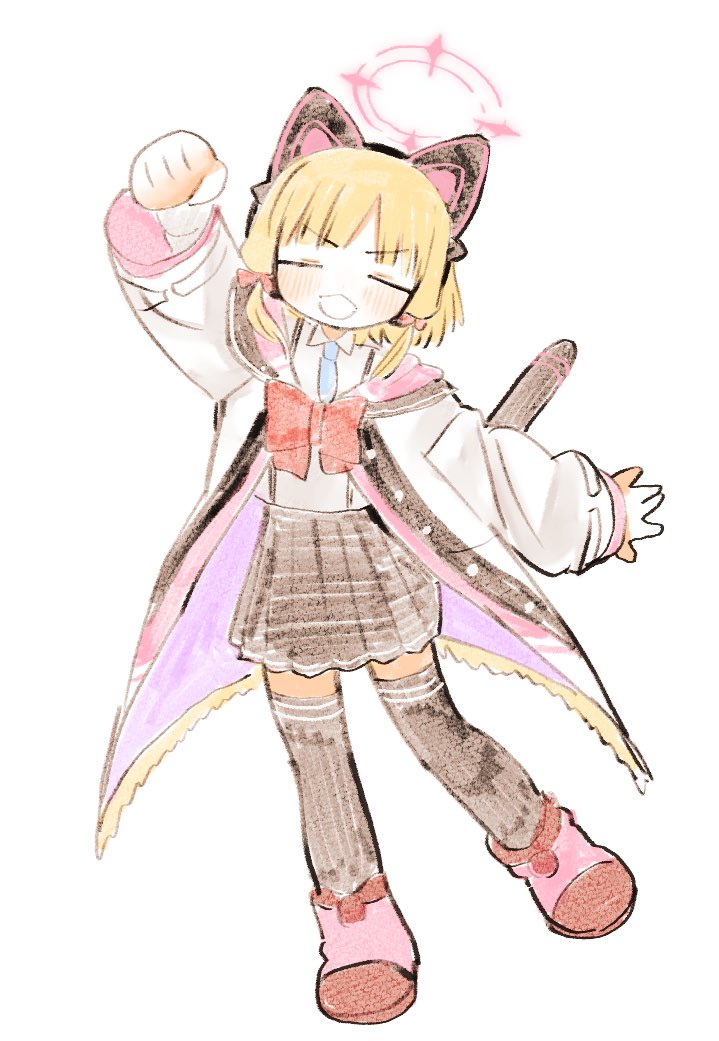 1girl animal_ear_headphones animal_ears arm_up black_skirt black_thighhighs blonde_hair blue_archive blue_necktie bow bowtie cat_ear_headphones cat_ears cat_tail closed_eyes fake_animal_ears halo headphones hood hooded_jacket jacket long_sleeves low_twintails momoi_(blue_archive) necktie open_mouth pink_halo pleated_skirt red_bow red_bowtie shinbashi_seiji shirt simple_background skirt solo tail thighhighs twintails white_background white_jacket white_shirt