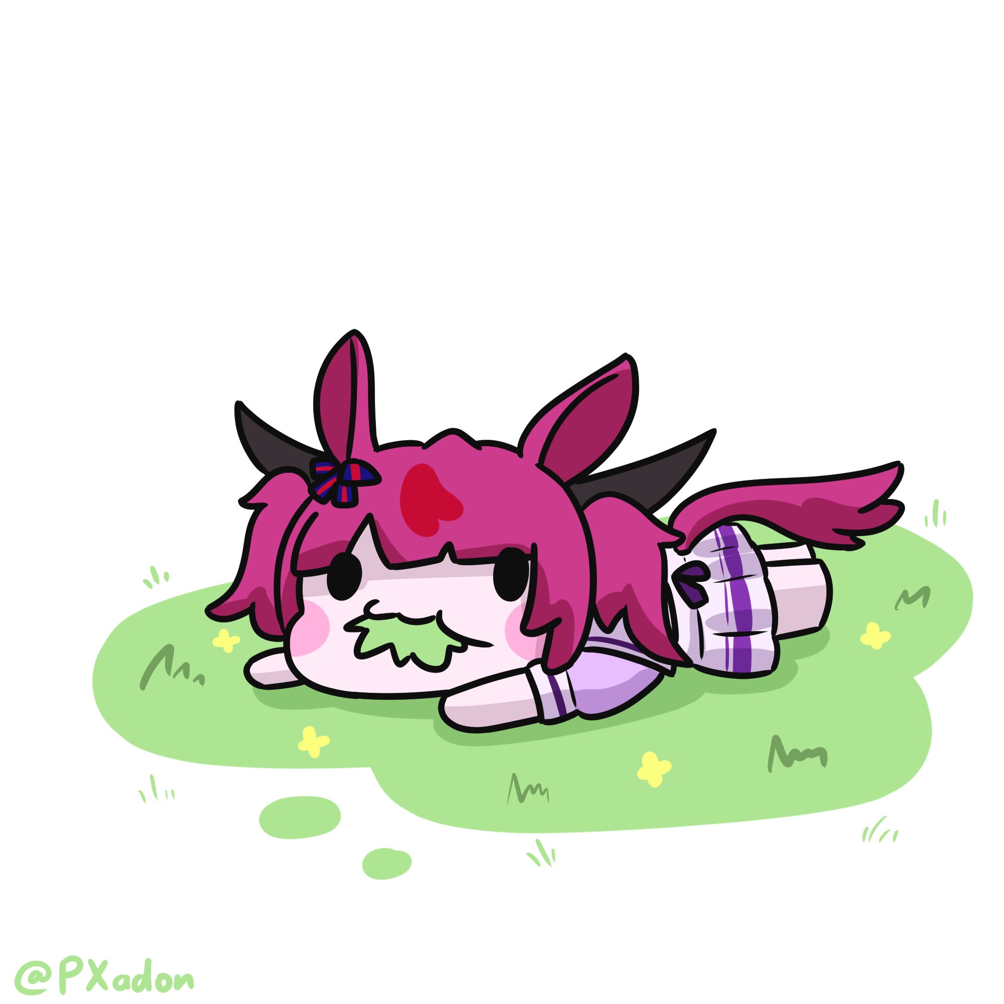 1girl animal_ears chibi crossover eating_grass grass highres hololive hololive_english horse_ears horse_girl horse_tail irys_(hololive) red_hair tail umamusume virtual_youtuber