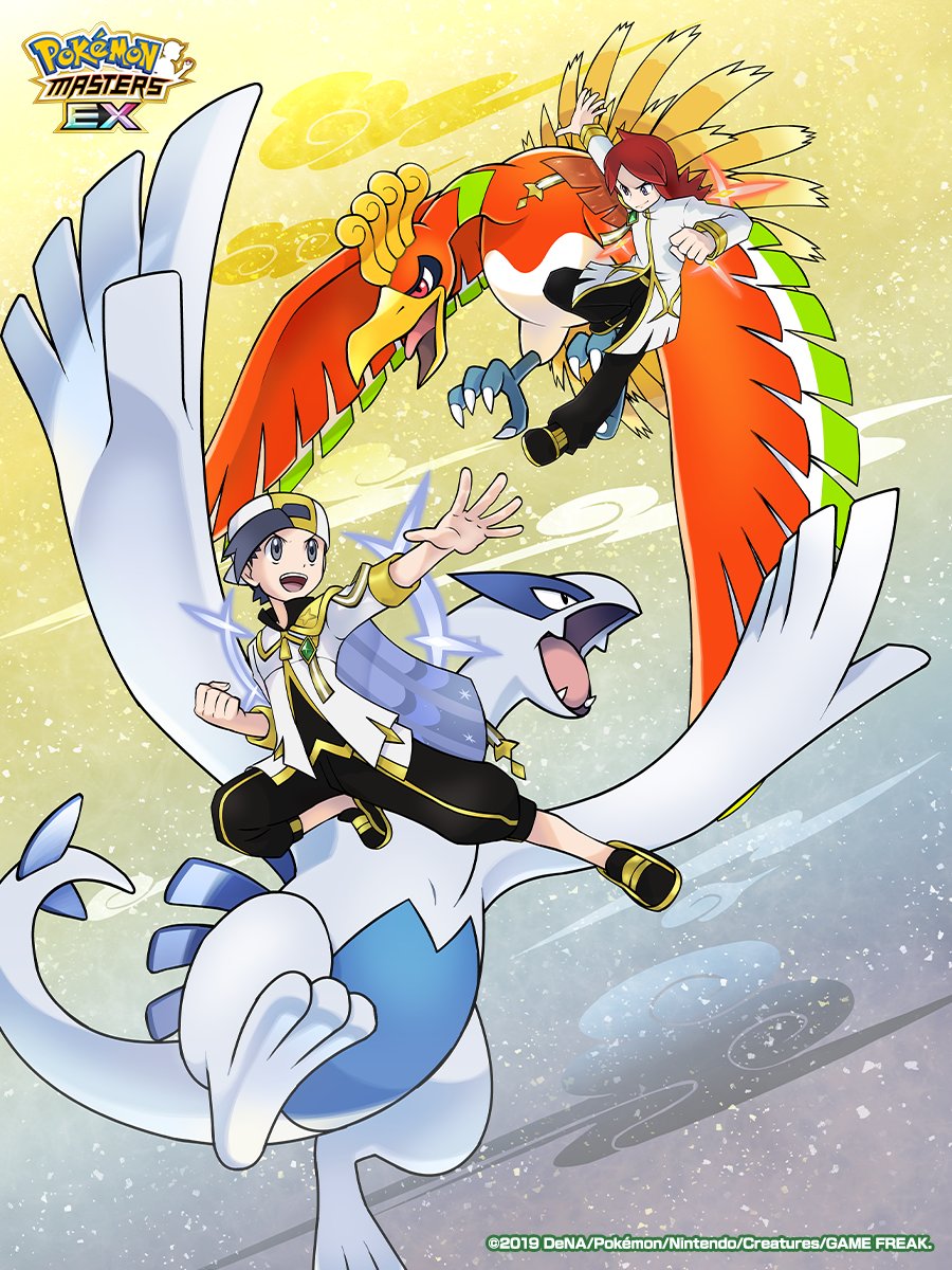 2boys backwards_hat baseball_cap bird black_hair closed_mouth ethan_(arc_suit)_(pokemon) ethan_(pokemon) fangs feathers flying full_body gen_2_pokemon hat highres ho-oh jacket legendary_pokemon long_hair long_sleeves lugia multiple_boys nintendo official_alternate_costume official_art open_mouth pants pokemon pokemon_(creature) pokemon_masters_ex red_eyes red_hair shirt short_hair silver_(arc_suit)_(pokemon) silver_(pokemon) smile tail wings