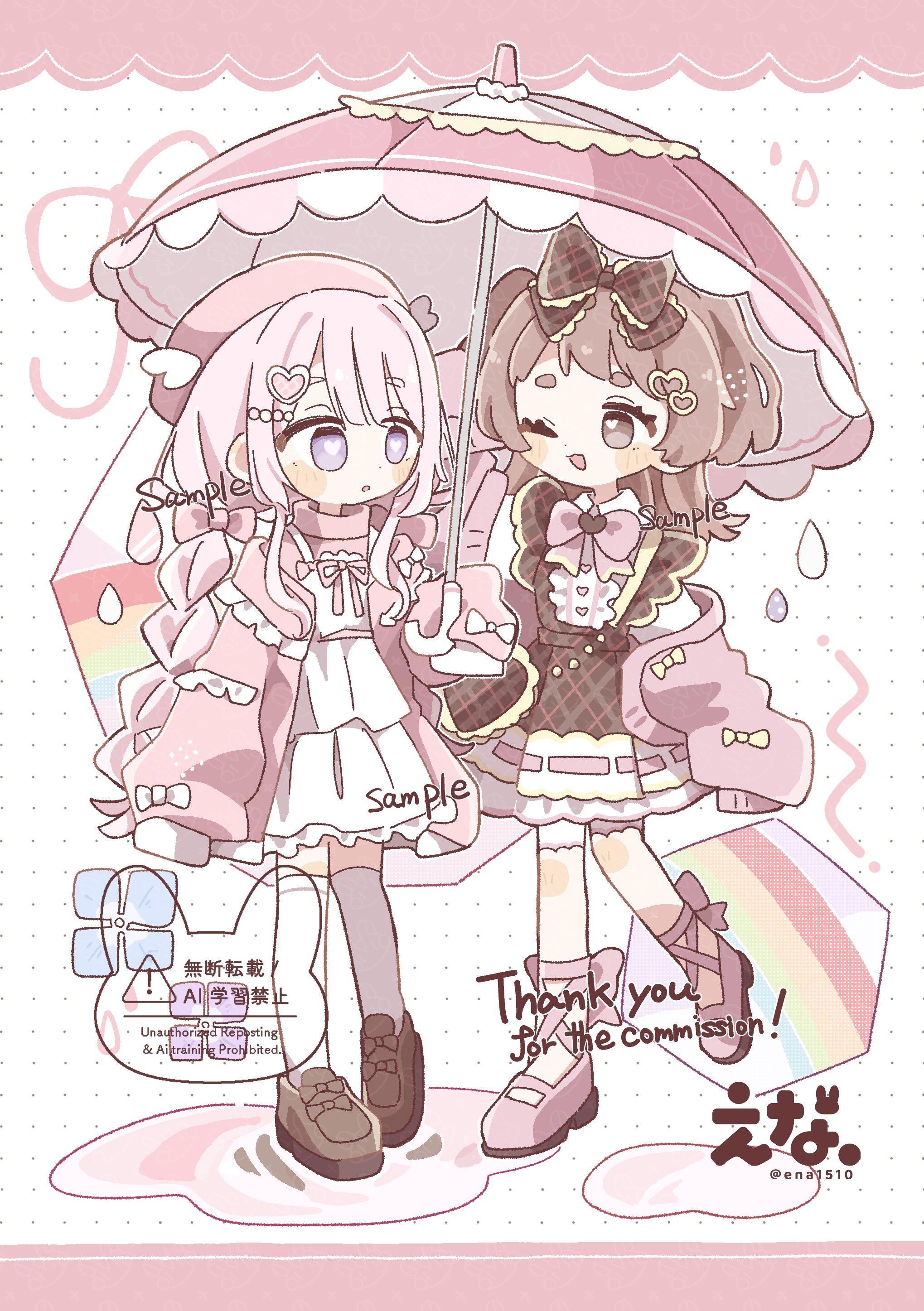 2girls :o ;d absurdres artist_name black_bow blush_stickers borrowed_character bow bowtie braid brown_eyes brown_hair brown_shoes brown_skirt collared_shirt commentary commission dress ena_1510 full_body hair_ornament hat heart heart-shaped_pupils heart_hair_ornament highres holding holding_umbrella jacket long_hair long_sleeves multiple_girls one_eye_closed open_clothes open_jacket open_mouth original pink_bow pink_bowtie pink_hair pink_hat pink_jacket pink_shoes pink_umbrella plaid_bow plaid_clothes plaid_skirt puddle purple_eyes rainbow sample_watermark shirt shoes skeb_commission skirt sleeves_past_fingers sleeves_past_wrists smile standing symbol-shaped_pupils thick_eyebrows thighhighs twin_braids twitter_username umbrella watermark white_background white_dress white_shirt white_thighhighs
