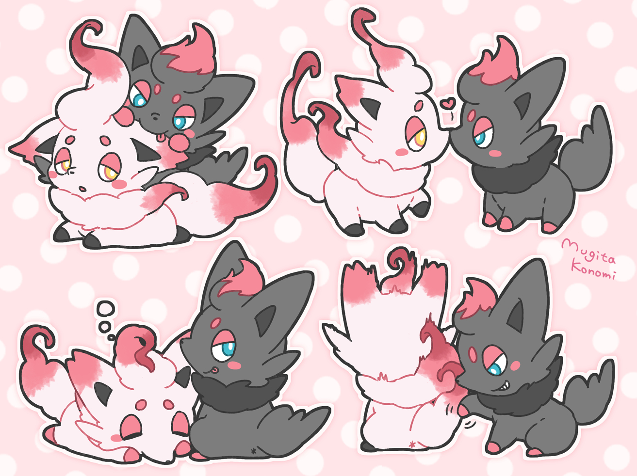 animal_focus aqua_eyes blush_stickers bright_pupils bubble commentary_request gen_5_pokemon heart hisuian_zorua lying mugita_konomi nibbling nintendo no_humans noses_touching on_stomach outline pokemon pokemon_(creature) signature sleeping smirk tongue tongue_out white_pupils yellow_eyes zorua