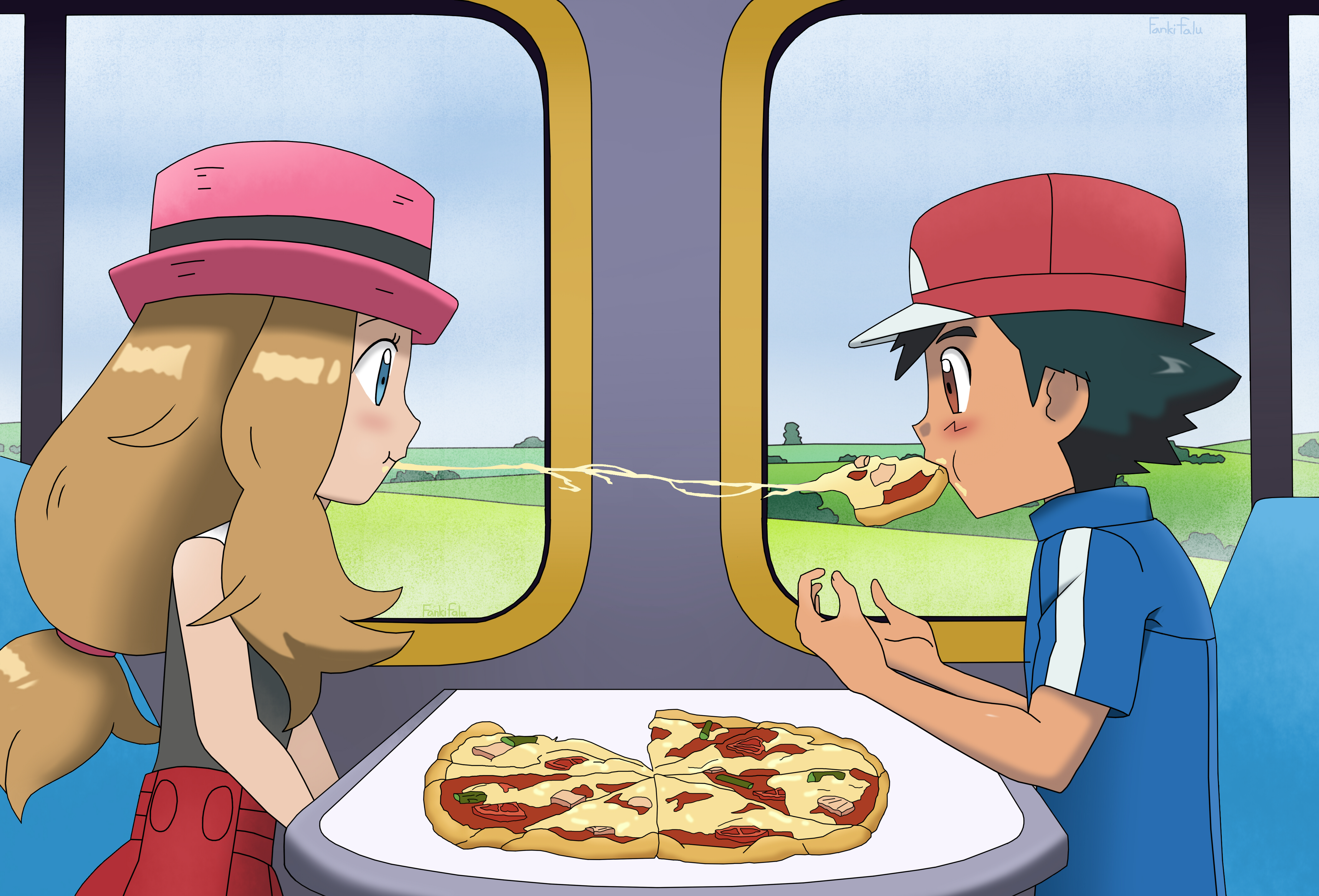 1boy 1girl absurdres arms_at_sides ash_ketchum bare_shoulders baseball_cap black_shirt blonde_hair blue_eyes blush cheese child collared_shirt couple eating eye_contact eyelashes fankifalu flat_chest food food_in_mouth from_side hands_up hat highres long_hair looking_at_another low-tied_long_hair nintendo pizza pizza_slice pokemon pokemon_(anime) pokemon_the_series:_xy profile serena_(pokemon) shirt short_hair short_sleeves sidelocks sitting sleeveless sleeveless_shirt train_interior vehicle_interior