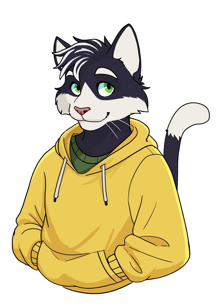 1boy animal_ears cat_boy cat_ears cat_tail closed_mouth commentary english_commentary furry furry_male green_shirt hands_in_pockets highres hood hood_down hoodie jayce_(socially_awkward) looking_at_viewer male_focus monchimutt shirt smile socially_awkward tail upper_body whiskers white_background yellow_hoodie
