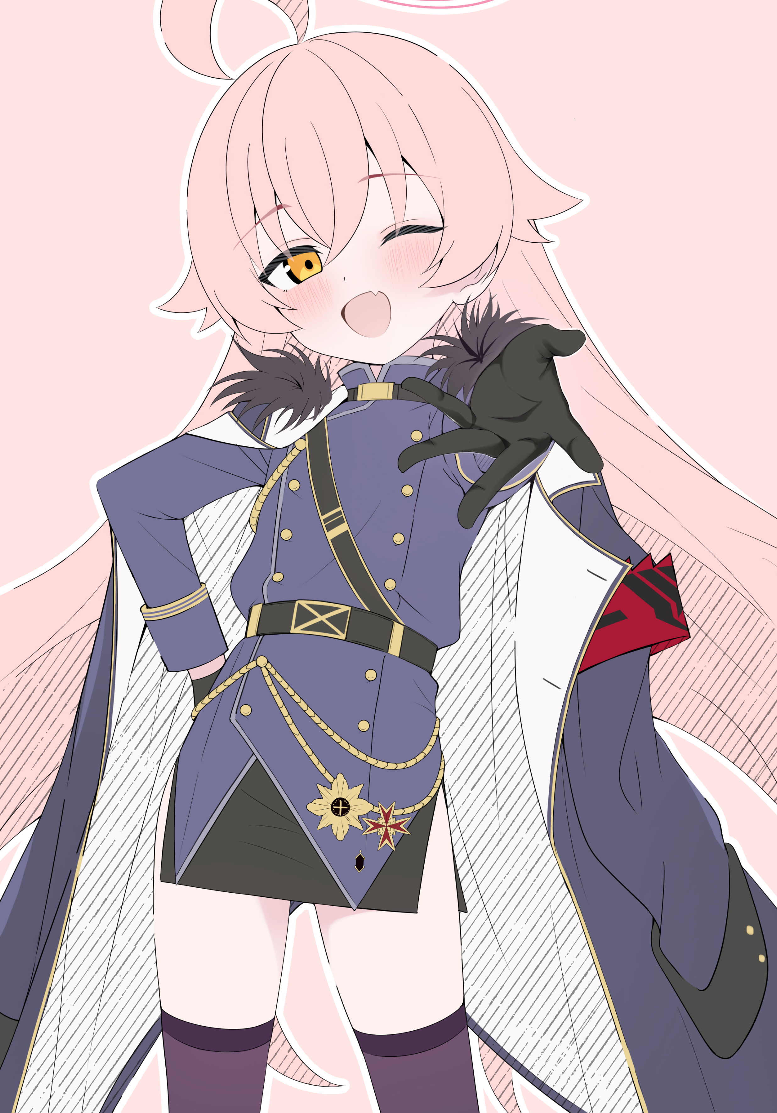 1girl ;d absurdres ahoge black_gloves blue_archive cosplay fur-trimmed_jacket fur_trim gloves highres hina_(blue_archive) hina_(blue_archive)_(cosplay) hoshino_(blue_archive) jacket long_hair looking_at_viewer mistel_(sukebemistel) one_eye_closed open_mouth pink_background pink_hair simple_background smile solo standing thighs yellow_eyes
