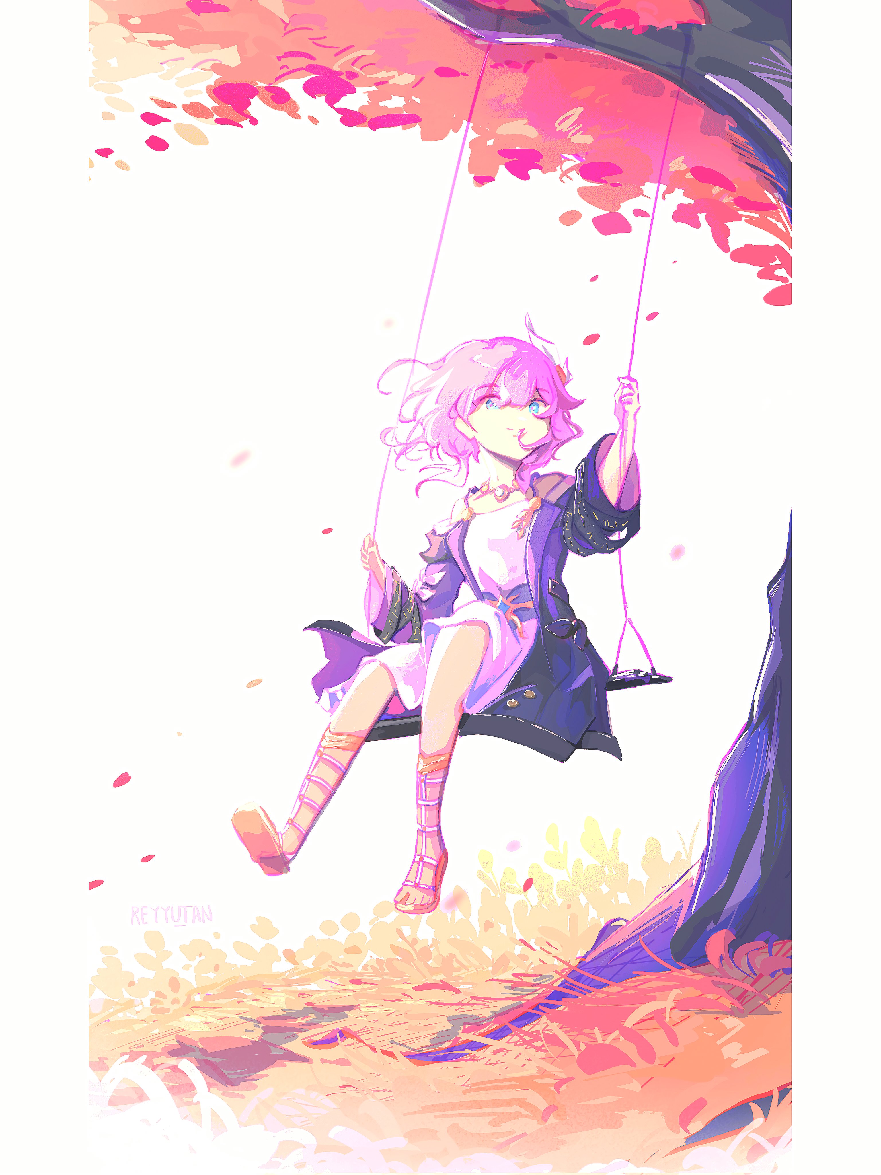 1girl absurdres blue_eyes breasts coat commentary cyrene_(philia093)_(honkai:_star_rail) cyrene_(honkai:_star_rail) dress falling_leaves hair_ornament highres honkai:_star_rail honkai_(series) jewelry leaf looking_at_viewer medium_hair necklace on_swing outdoors pink_hair purple_coat reyyu_tan sandals small_breasts smile solo swing untranslatable_commentary tree white_dress