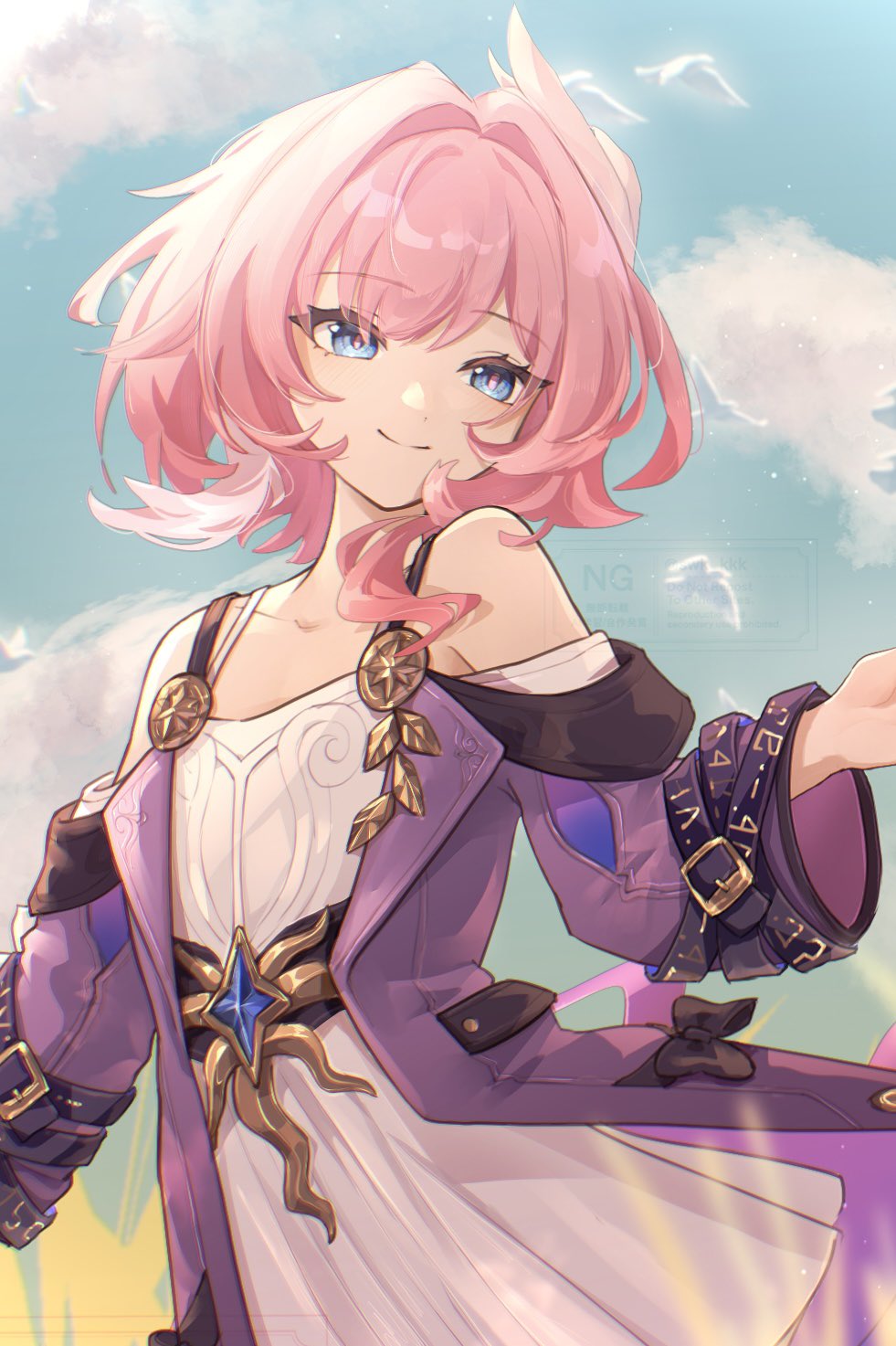 1girl bare_shoulders blue_eyes blue_sky breasts cloud coat commentary cyrene_(philia093)_(honkai:_star_rail) cyrene_(honkai:_star_rail) day dress hair_ornament highres honkai:_star_rail honkai_(series) looking_at_viewer medium_hair multicolored_hair outdoors pink_hair pink_pupils purple_coat sky small_breasts smile solo suwa_(swk_kkk) untranslatable_commentary two-tone_hair white_dress white_hair