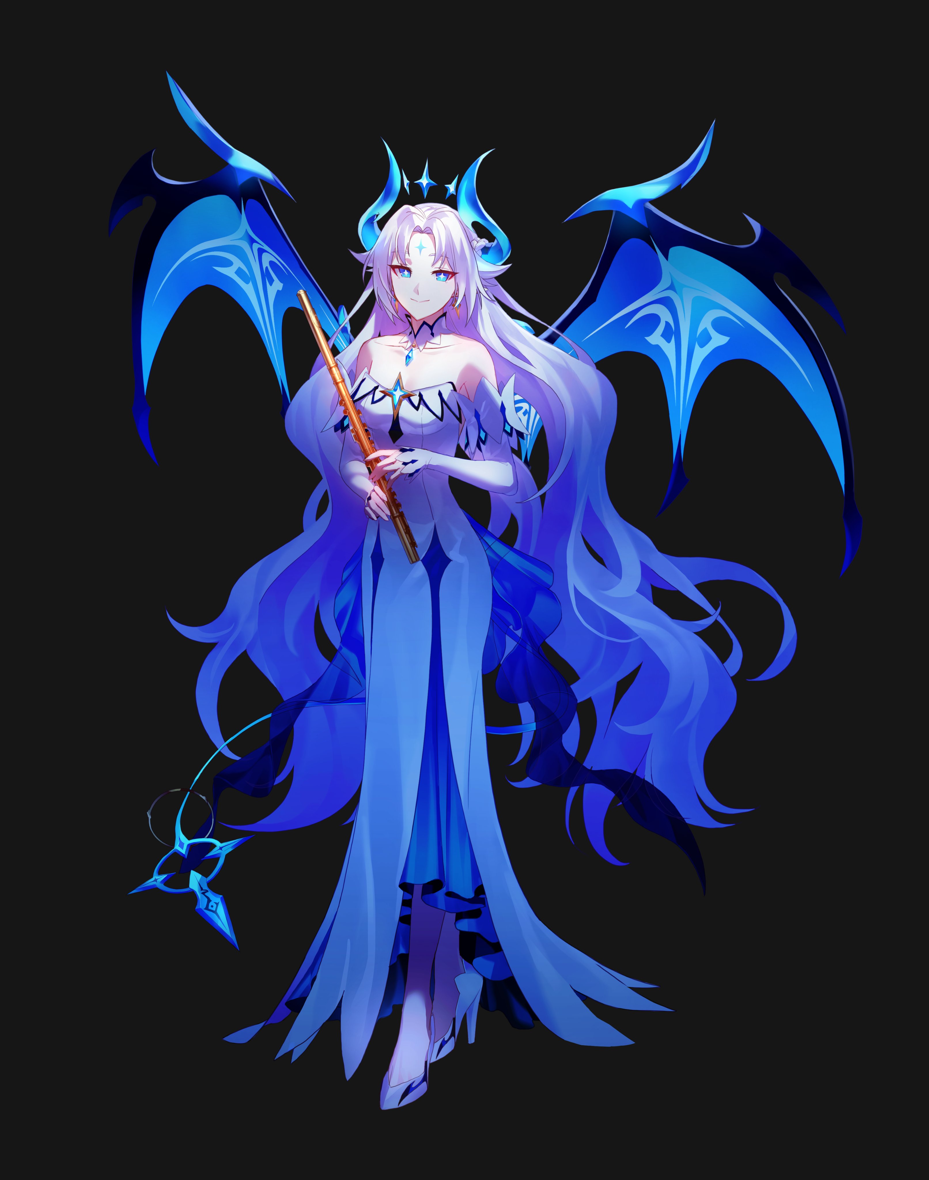 1girl absurdres alternate_costume bare_shoulders black_background blue_dress blue_eyes blue_horns blue_wings braid breasts bright_pupils choker closed_mouth collarbone curtained_hair demon_girl demon_horns demon_tail demon_wings detached_sleeves dress earrings elsword facial_mark floating_headgear flute forehead_mark full_body hair_flaps half_up_braid headgear high_heels highres holding holding_flute holding_instrument horns instrument ishtar_(elsword) jewelry korean_commentary layered_dress long_dress long_hair long_sleeves looking_at_viewer luciela_r._sourcream medium_breasts nt_0803 parted_bangs pointy_ears shoes simple_background sleeves_past_wrists smile solo standing star-shaped_pupils star_(symbol) strapless strapless_dress symbol-shaped_pupils tail two-tone_dress very_long_hair wavy_hair white_choker white_dress white_hair white_pupils white_shoes wings