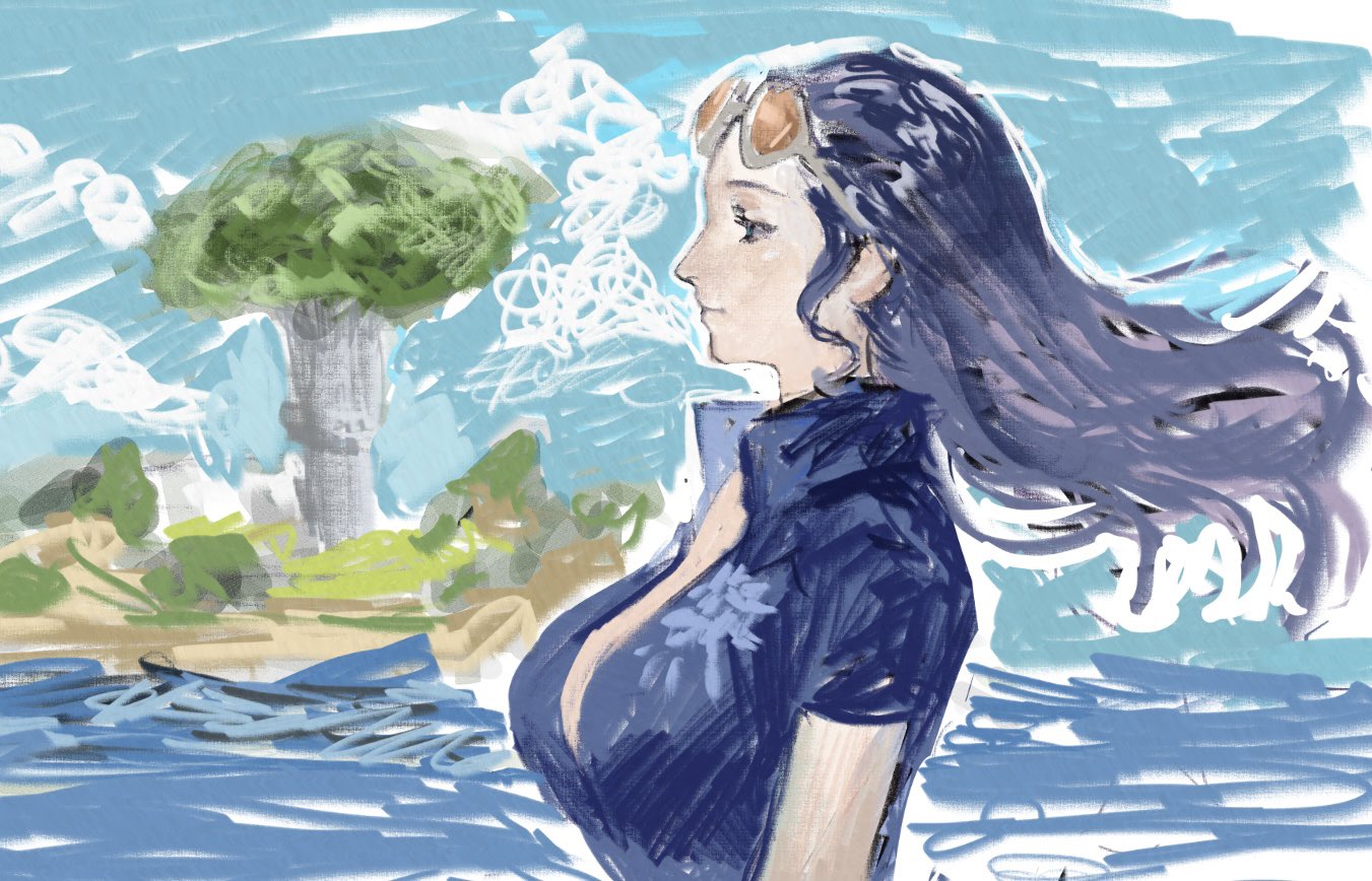 1girl black_hair blue_sky borukeinosatie breasts cleavage_cutout closed_mouth clothing_cutout cloud collared_shirt eyewear_on_head floating_hair island large_breasts long_hair nico_robin nico_robin_(return_to_sabaody) ocean official_alternate_costume one_piece shirt sky solo sunglasses tree upper_body water