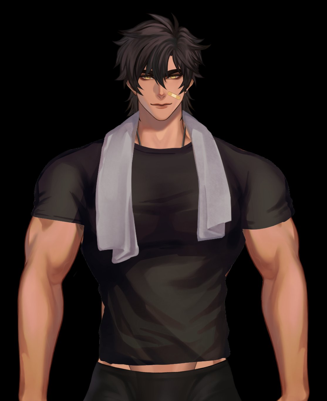 1boy bandaid bandaid_on_face black_shirt brown_hair ear_piercing highres indie_virtual_youtuber jouvru kite_hasegawa male_focus muscular muscular_male piercing shirt towel towel_around_neck yellow_eyes