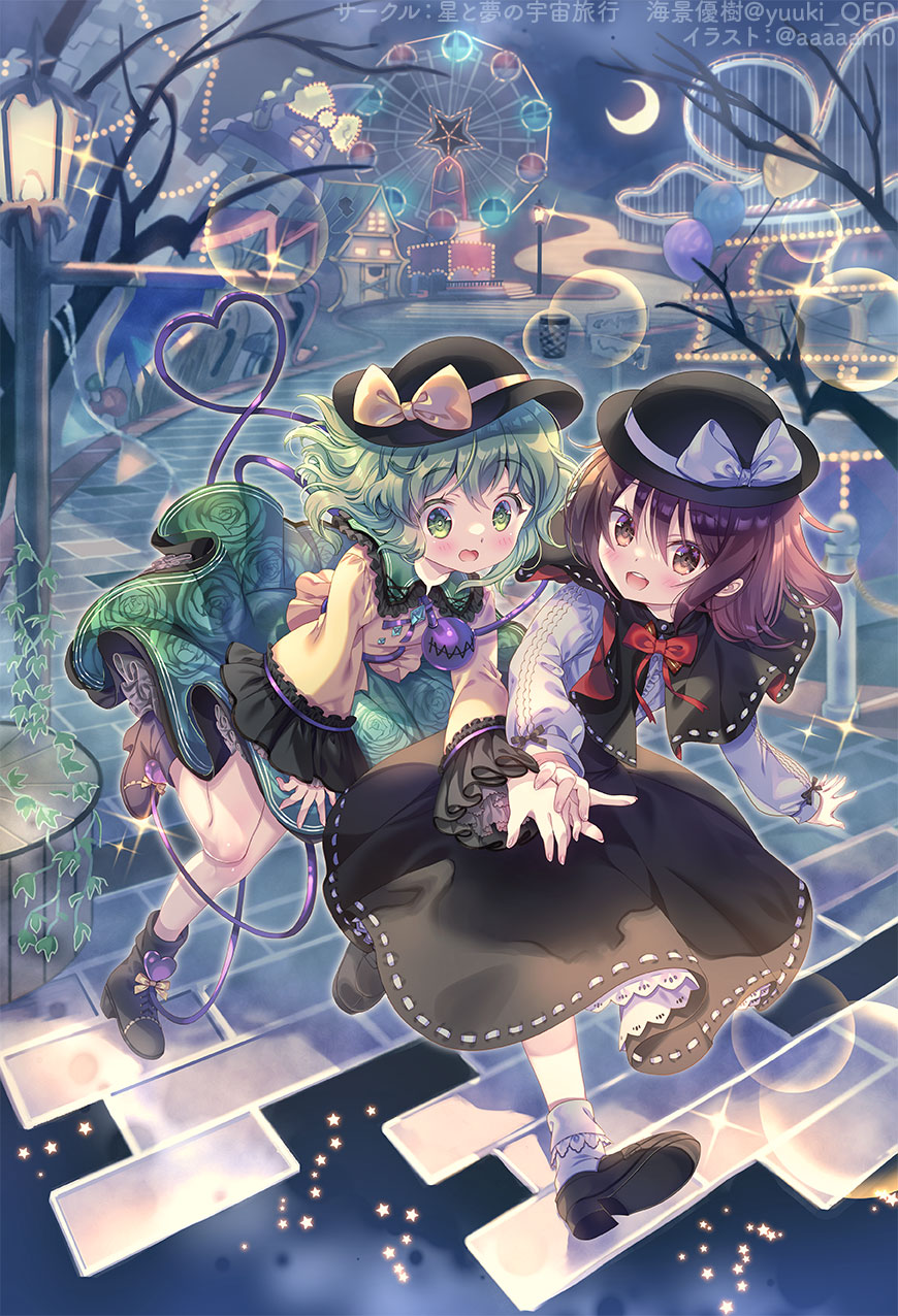 2girls amo_(shibu3) black_boots black_capelet black_dress black_hat boots bow branch brick_road brown_eyes brown_hair bubble capelet crescent_moon dress ferris_wheel floral_print floral_print_skirt fog frilled_sleeves frills green_eyes green_hair green_skirt hat highres holding_hands knees komeiji_koishi lamp lamppost moon multiple_girls open_mouth plant print_skirt red_bow ribbon road roller_coaster rope_fence running shirt skirt smile star_(sky) stitched_eye third_eye touhou trash_can usami_renko vines watermark white_ribbon white_shirt yellow_bow yellow_ribbon yellow_shirt
