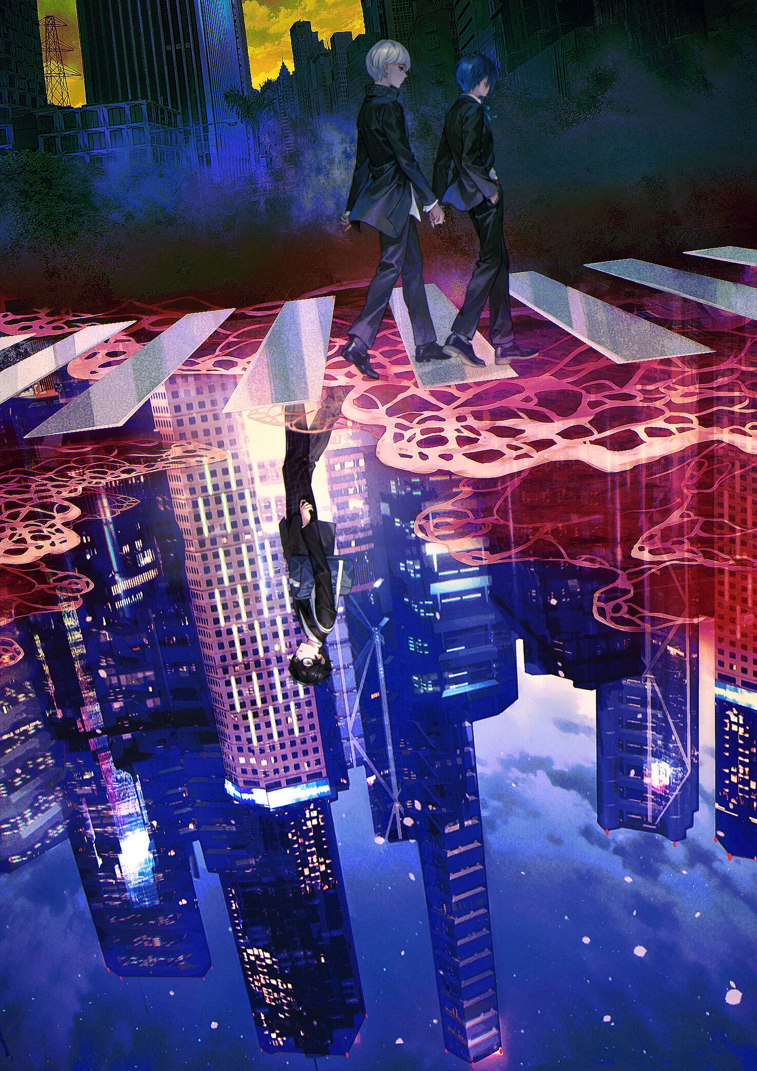 3boys amamiya_ren bag black_hair black_jacket black_pants black_shoes blazer blue_bag blue_hair blue_sky building city city_lights cityscape crosswalk different_reflection dress_shirt facing_to_the_side glasses grey_hair hands_in_pockets highres jacket kotomeiro male_focus multiple_boys narukami_yu night open_clothes open_jacket outdoors pants persona persona_3 persona_4 persona_5 puddle reflection school_uniform shirt shoes sky skyline skyscraper tote_bag two-tone_background untucked_shirt walking water white_shirt yellow_sky yuuki_makoto_(persona_3)