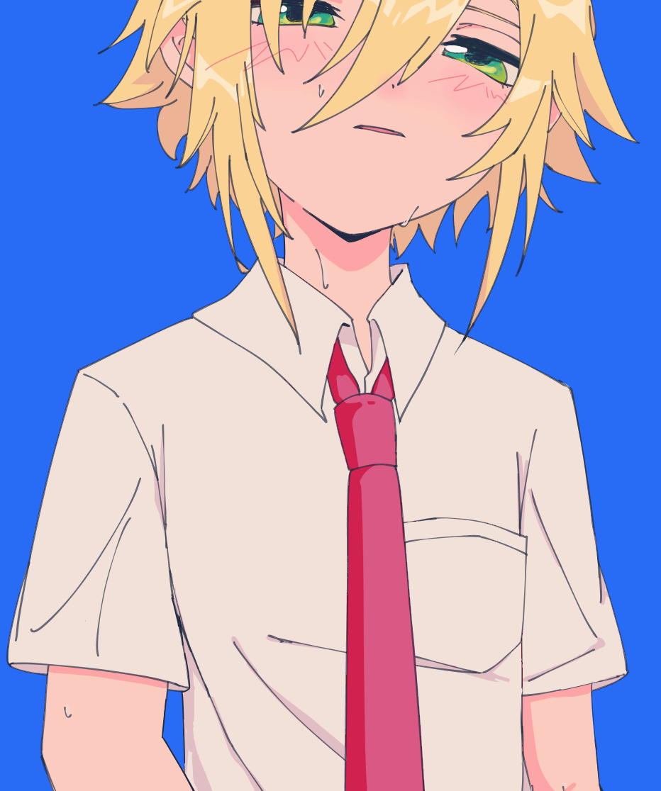 blonde_hair blue_background blush green_eyes necktie nijisanji r7defdupyt83820 red_necktie sweat uzuki_kou virtual_youtuber