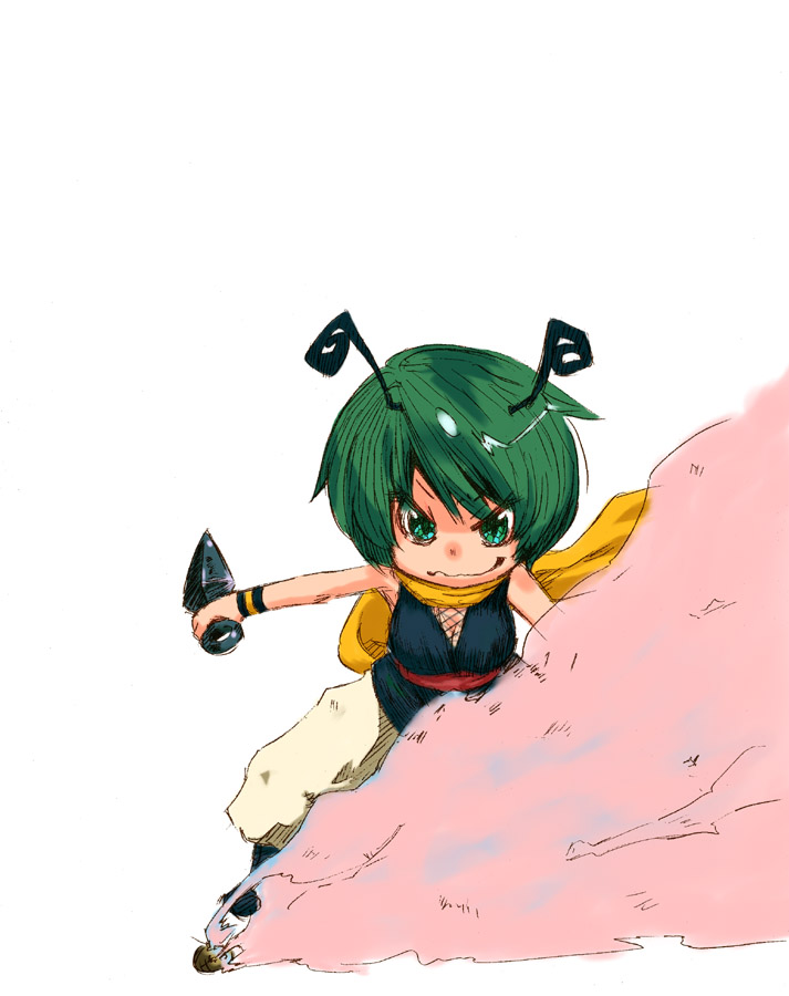 1girl alternate_costume antennae black_shirt closed_mouth commentary_request fishnet_top fishnets full_body green_eyes green_hair holding holding_kunai holding_weapon kazuiyun kunai looking_at_viewer ninja pants scarf shirt short_hair simple_background sleeveless sleeveless_shirt smile solo touhou weapon white_background white_pants wriggle_nightbug yellow_scarf