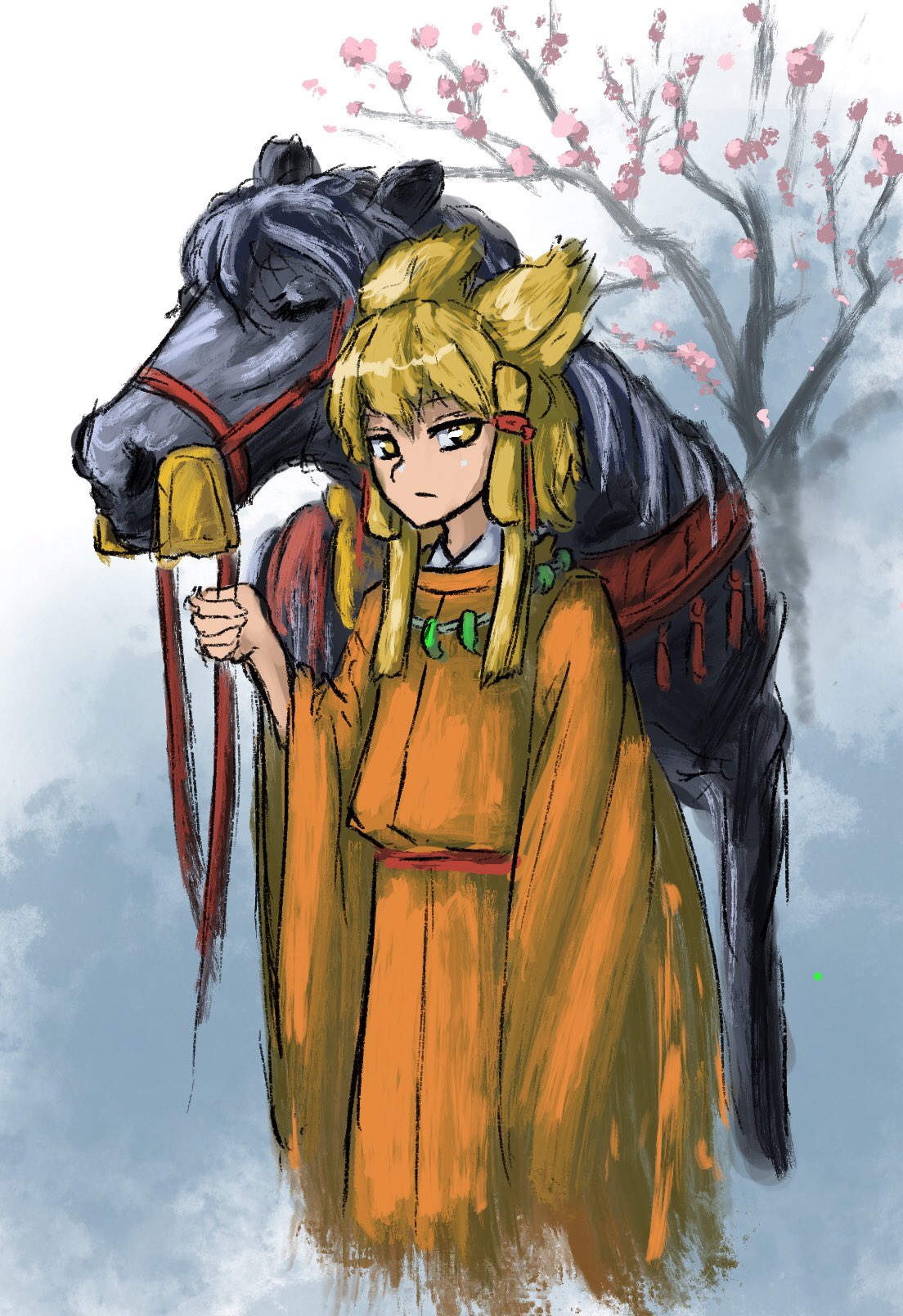 1girl alternate_costume blonde_hair blue_background cherry_blossoms closed_mouth commentary_request cowboy_shot expressionless folded_hair highres holding holding_reins horse japanese_clothes kimono kurokoma_saki kurokoma_saki_(pegasus) looking_at_viewer orange_kimono pointy_hair reins ritsuzou short_hair solo touhou toyosatomimi_no_miko tree yellow_eyes