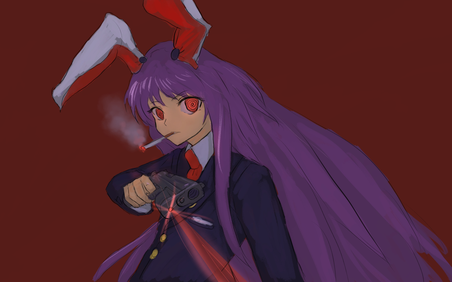 1girl animal_ears black_jacket blazer cigarette collared_shirt commentary_request gun handgun holding holding_gun holding_weapon jacket laser_sight long_hair long_sleeves looking_at_viewer necktie open_mouth purple_hair rabbit_ears rabbit_girl red_background red_eyes red_necktie reisen_udongein_inaba ritsuzou shirt simple_background smoke smoking solo touhou upper_body very_long_hair weapon white_shirt