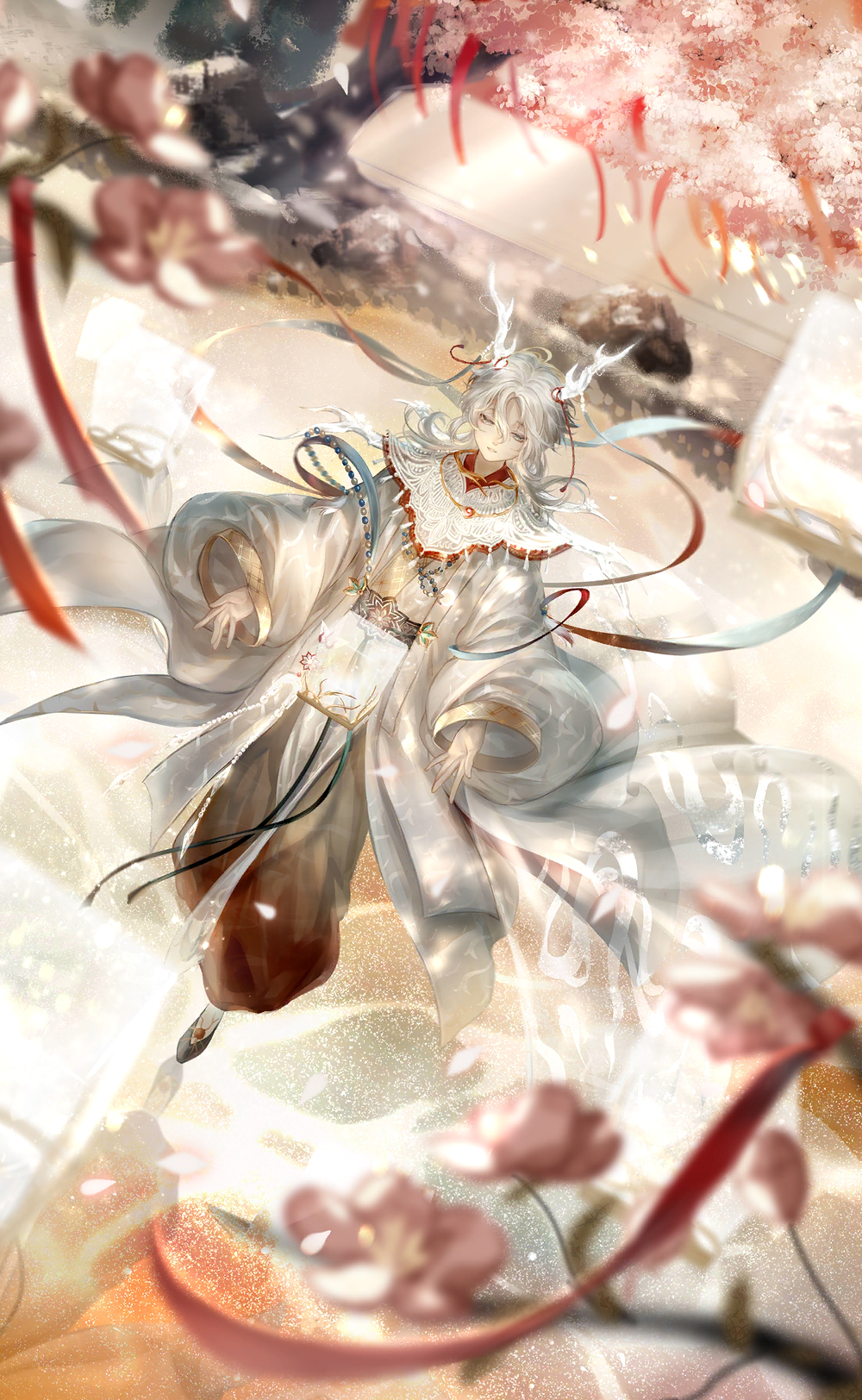 1boy artist_request beads black_pants black_shoes blue_eyes bush capelet cherry_blossoms chinese_clothes dragon_horns expressionless floating flower full_body game_cg hagoromo hair_between_eyes half-closed_eyes hanfu highres horn_ornament horn_ribbon horns long_hair long_sleeves luming_(shining_nikki) male_focus nikki_(series) official_art outdoors pants parted_lips pink_flower prayer_beads puffy_long_sleeves puffy_pants puffy_sleeves red_ribbon ribbon shawl shining_nikki shoes socks solo spring_(season) white_capelet white_hair white_hanfu white_horns white_socks yunjian
