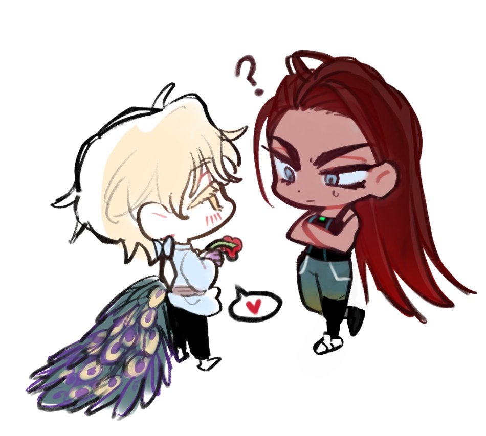 1boy 1girl ? alien_stage back_bow back_cutout black_pants black_tank_top blonde_hair blue_pants bow brown_hair chibi chibi_only clothing_cutout colored_eyelashes crossed_arms dark-skinned_female dark_skin flower grey_eyes heart holding holding_flower hyuna_(alien_stage) long_hair lubya luka_(alien_stage) pants peacock_feathers prosthesis prosthetic_leg shirt short_hair spoken_heart tank_top very_long_hair white_bow white_shirt yellow_eyes