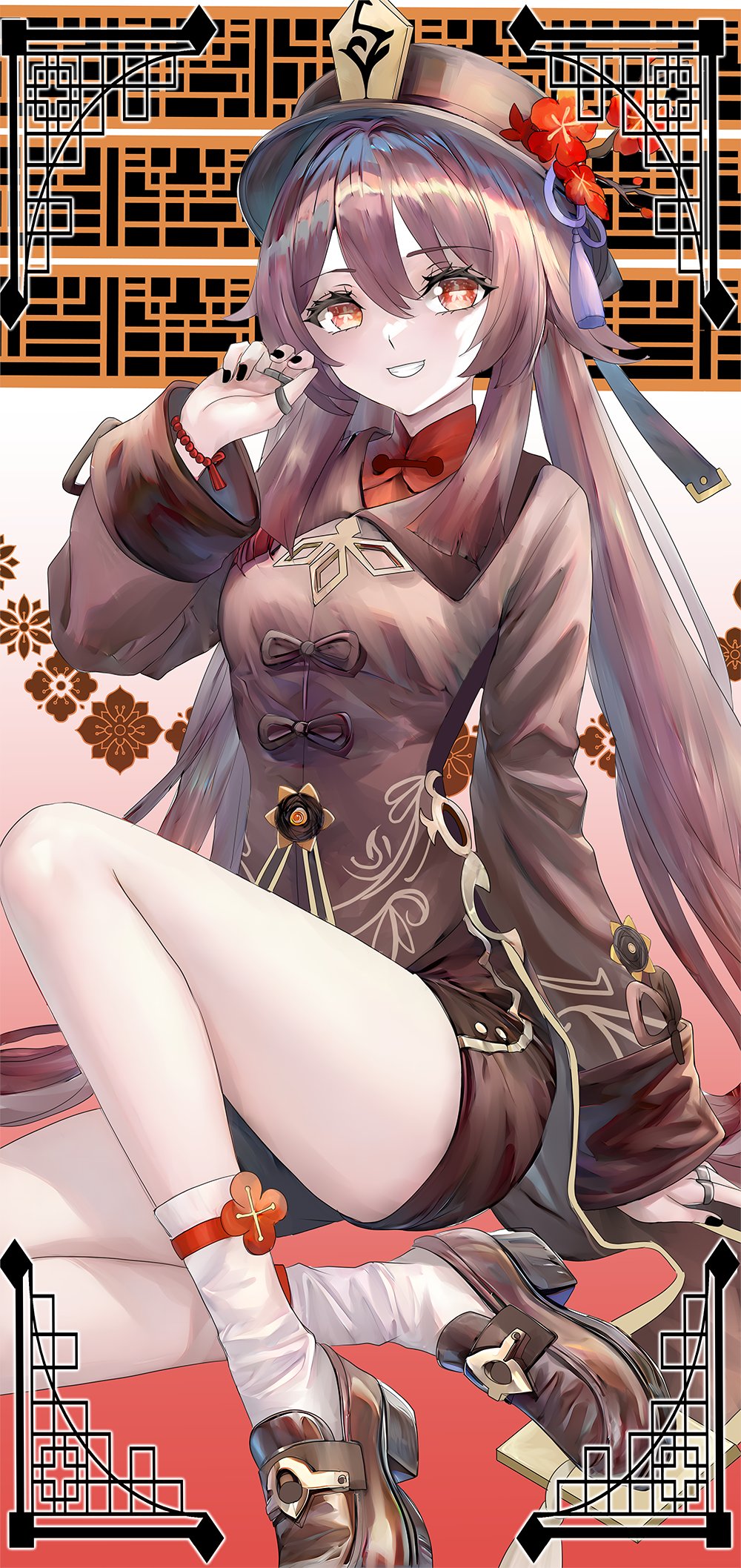 1girl black_hat black_nails black_shorts brown_hair brown_jacket brown_shoes commentary_request flower flower-shaped_pupils genshin_impact hat hat_flower highres hu_tao_(genshin_impact) jacket long_hair long_sleeves looking_at_viewer miyashirokiyu nail_polish red_eyes red_flower shoes shorts smile socks solo symbol-shaped_pupils thighs twintails white_socks