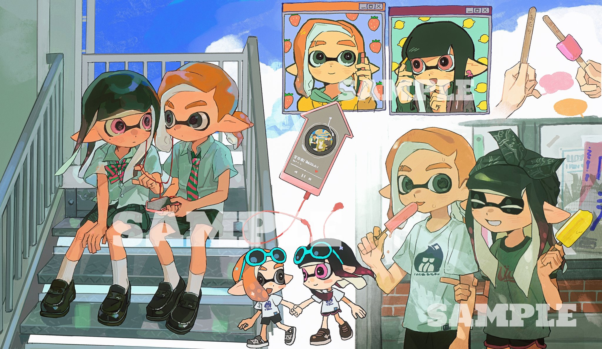 1boy 1girl black_hair black_shoes black_shorts black_skirt bow bowtie chibi chibi_inset collared_shirt commentary earphones eyebrow_cut food green_bow green_bowtie green_eyes green_shirt highres holding holding_food holding_phone holding_popsicle inkling inkling_boy inkling_girl inkling_player_character loafers long_hair medium_hair miko_(15476997) mole mole_under_eye multiple_views nintendo orange_hair parted_bangs phone pink_bow pink_bowtie pink_eyes pointy_ears ponytail popsicle sample_watermark school_uniform shared_earphones shirt shoes shorts skirt socks splatoon_(series) striped_bow striped_bowtie striped_clothes untranslatable_commentary tentacle_hair watermark white_shirt white_socks