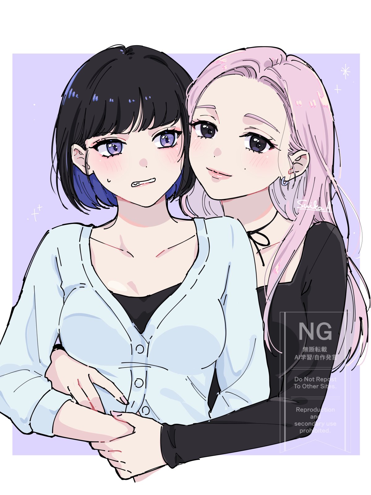 2girls amazaki_suika black_eyes black_hair black_ribbon black_shirt blue_cardigan border cardigan closed_mouth collarbone colored_inner_hair commentary_request cropped_torso earrings grimace hair_behind_ear hair_over_shoulder highres hug hug_from_behind jewelry light_blush long_hair long_sleeves mole mole_under_eye multicolored_hair multiple_girls neck_ribbon original outside_border parted_lips pink_background pink_hair purple_eyes purple_hair red_lips ribbon shirt simple_background smile sparkle sweatdrop swept_bangs watermark white_border yuri