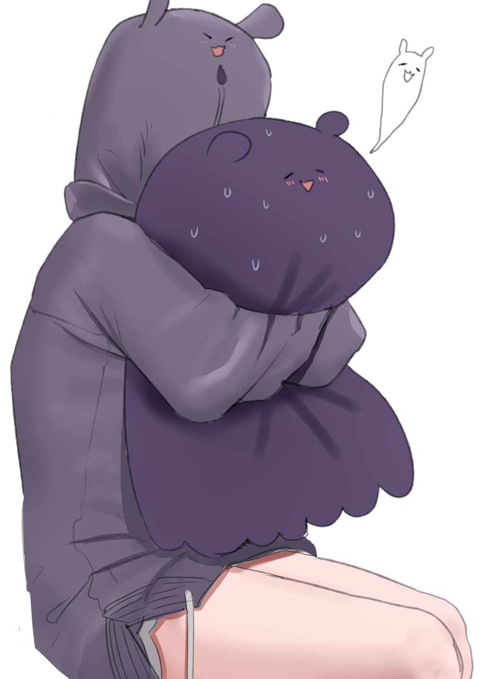 1girl grey_hoodie highres hololive hololive_english hood hood_up hoodie hug light_blush ninomae_ina'nis ninomae_ina'nis_(loungewear) official_alternate_costume open_mouth redi_(rasec_asdjh) sweat takodachi_(ninomae_ina'nis) virtual_youtuber white_background