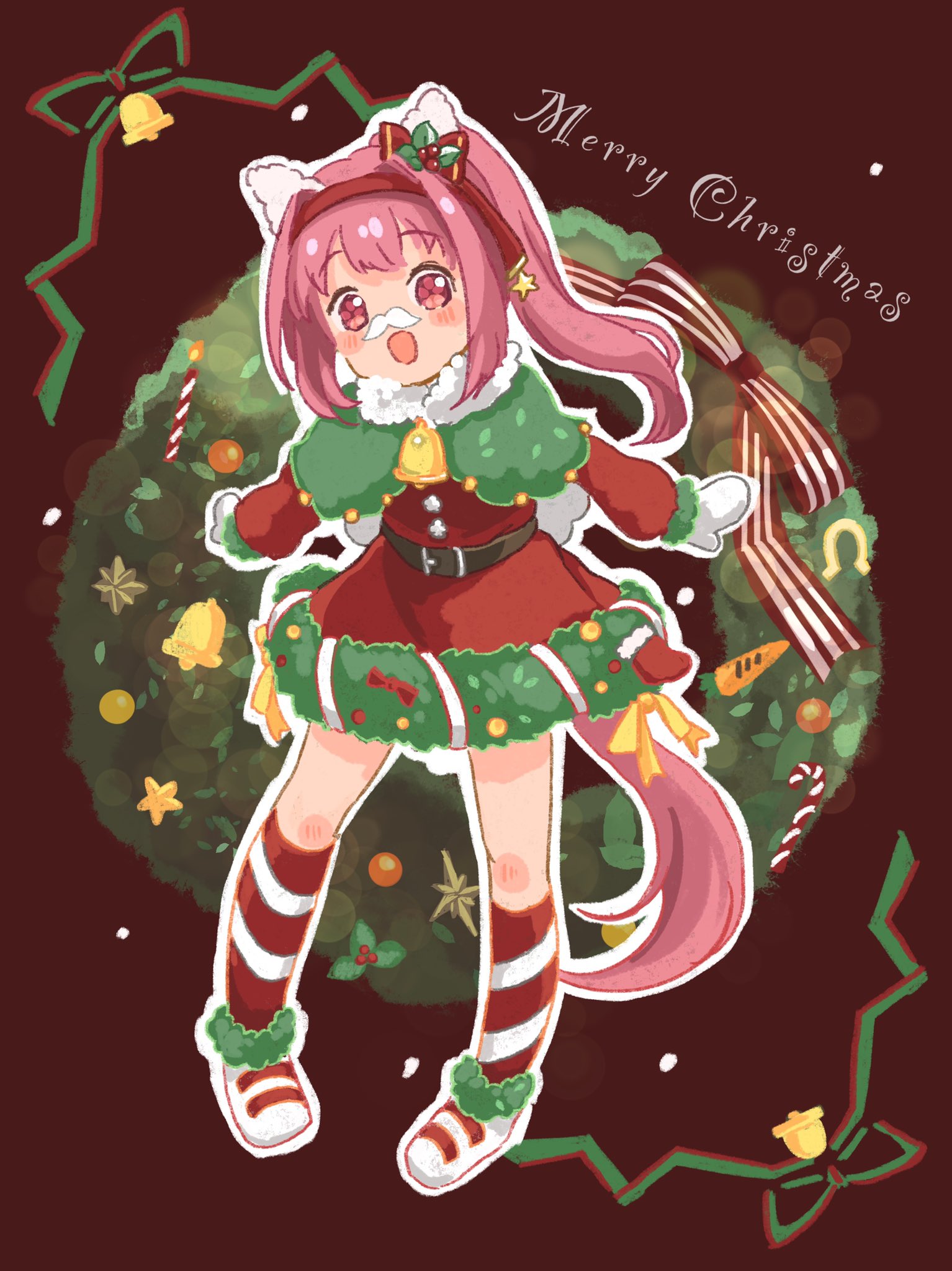 1girl :d animal_ears bell belt belt_buckle blush_stickers bow brown_belt buckle capelet christmas christmas_wreath commentary_request dress ear_bow fake_facial_hair fake_mustache flower-shaped_pupils full_body fur-trimmed_dress fur-trimmed_sleeves fur_trim green_capelet hairband haru_urara_(umamusume) highres horse_ears horse_girl horse_tail kneehighs long_hair long_sleeves merry_christmas mittens mochiusasa neck_bell open_mouth pigeon-toed pink_hair ponytail puffy_long_sleeves puffy_sleeves red_background red_bow red_dress red_eyes red_hairband shoes simple_background smile socks solo standing striped_bow striped_clothes striped_socks symbol-shaped_pupils tail umamusume white_hairband white_mittens white_shoes wreath
