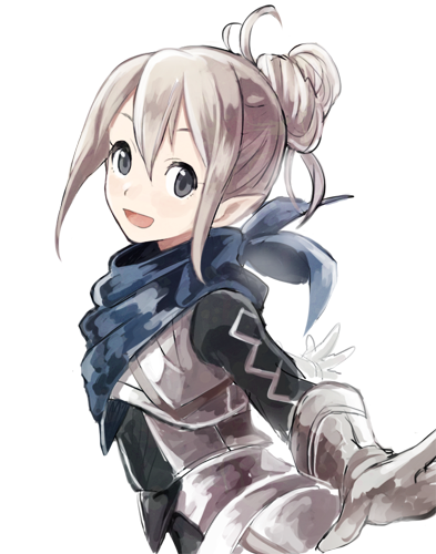 1girl :d black_eyes blue_scarf commentary_request female_kana_(fire_emblem) fire_emblem fire_emblem_fates from_side gloves grey_hair hair_between_eyes hair_bun harukawa_(ifk_e) long_sleeves looking_at_viewer lowres nintendo open_mouth pointy_ears scarf smile solo white_background white_gloves