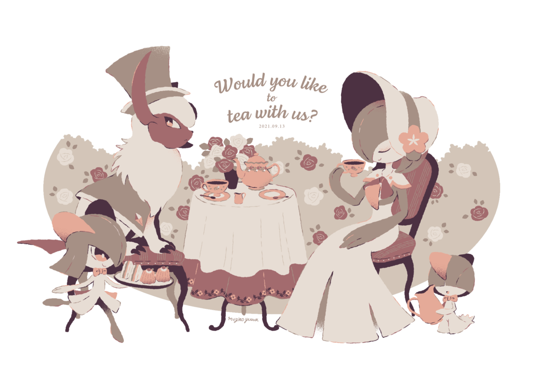 1girl absol absol_(fashionable) bonnet chair closed_eyes commentary cup english_text flower food gardevoir gardevoir_(fashionable) gen_3_pokemon highres holding holding_cup holding_plate kirlia manami_(uovoegg) nintendo plate pokemon pokemon_unite ralts red_flower red_rose rose sandwich sitting smile untranslatable_commentary tablecloth tea_party teacup teapot white_flower white_rose