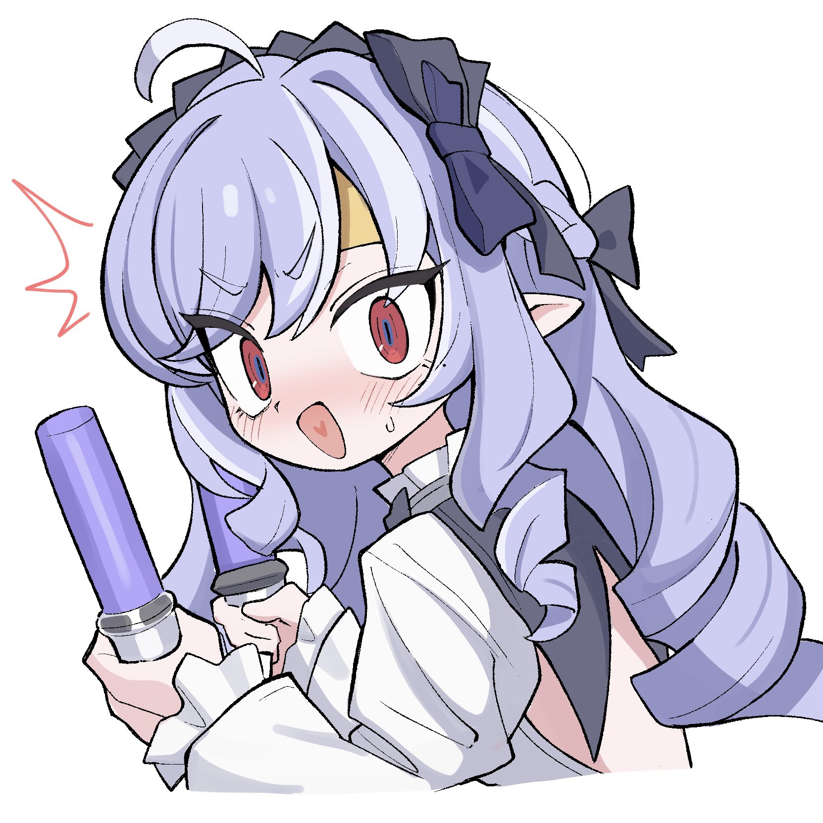 1girl ahoge back_cutout black_bow black_hairband blush bow clothing_cutout drill_hair from_side glowstick hair_bow hairband headband heart heart_in_mouth highres holding holding_glowstick ketsu_juuji_killer_(kejuki) long_hair long_sleeves looking_at_viewer open_mouth pointy_ears purple_hair red_eyes sidelocks simple_background solo surprised sweat upper_body vivian_banshee white_background yellow_headband zenless_zone_zero