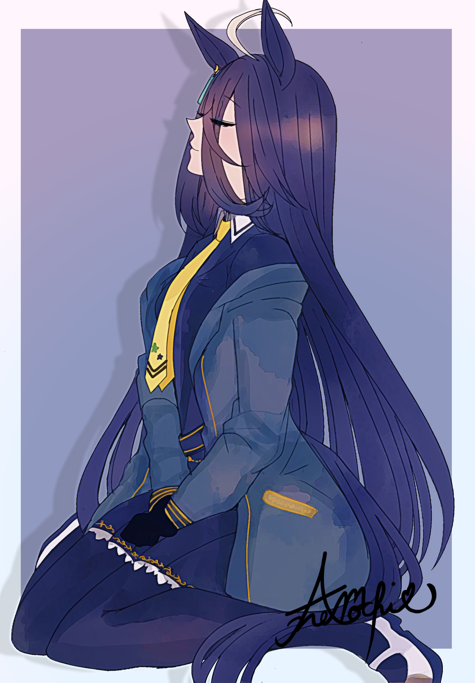 1girl ahoge animal_ears artist_name b9pqpy black_hair black_pantyhose black_shirt black_skirt closed_eyes closed_mouth collared_shirt ear_tag earrings hair_between_eyes highres horse_ears horse_girl horse_tail jewelry long_hair long_hair_between_eyes manhattan_cafe_(umamusume) multicolored_hair necktie pantyhose pleated_skirt shirt shoes signature single_earring sitting skirt smile solo tail umamusume very_long_hair wariza white_hair white_shoes white_trim yellow_necktie