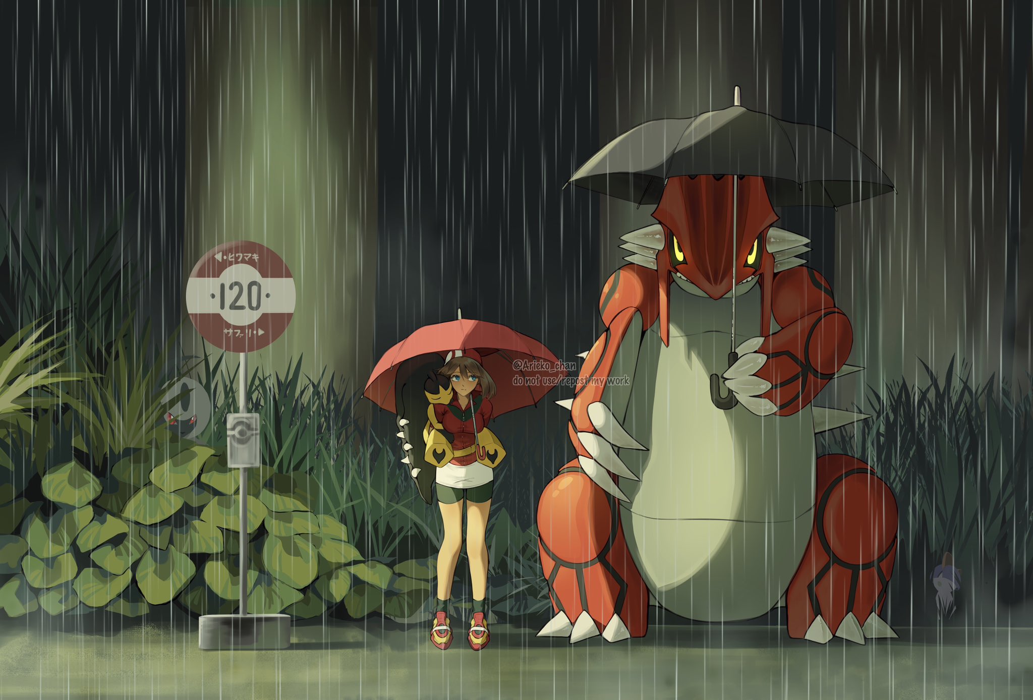 1girl absol alternate_color ariekochan bandana black_shorts blue_eyes breasts brown_hair gen_3_pokemon groudon highres holding holding_umbrella jacket large_breasts legendary_pokemon mawile may_(pokemon) nintendo outdoors poke_ball pokemon pokemon_(creature) pokemon_ruby/sapphire/emerald rain ralts red_bandana red_jacket shiny_pokemon shorts skirt spikes standing tonari_no_totoro twitter_username umbrella watermark white_skirt yellow_eyes