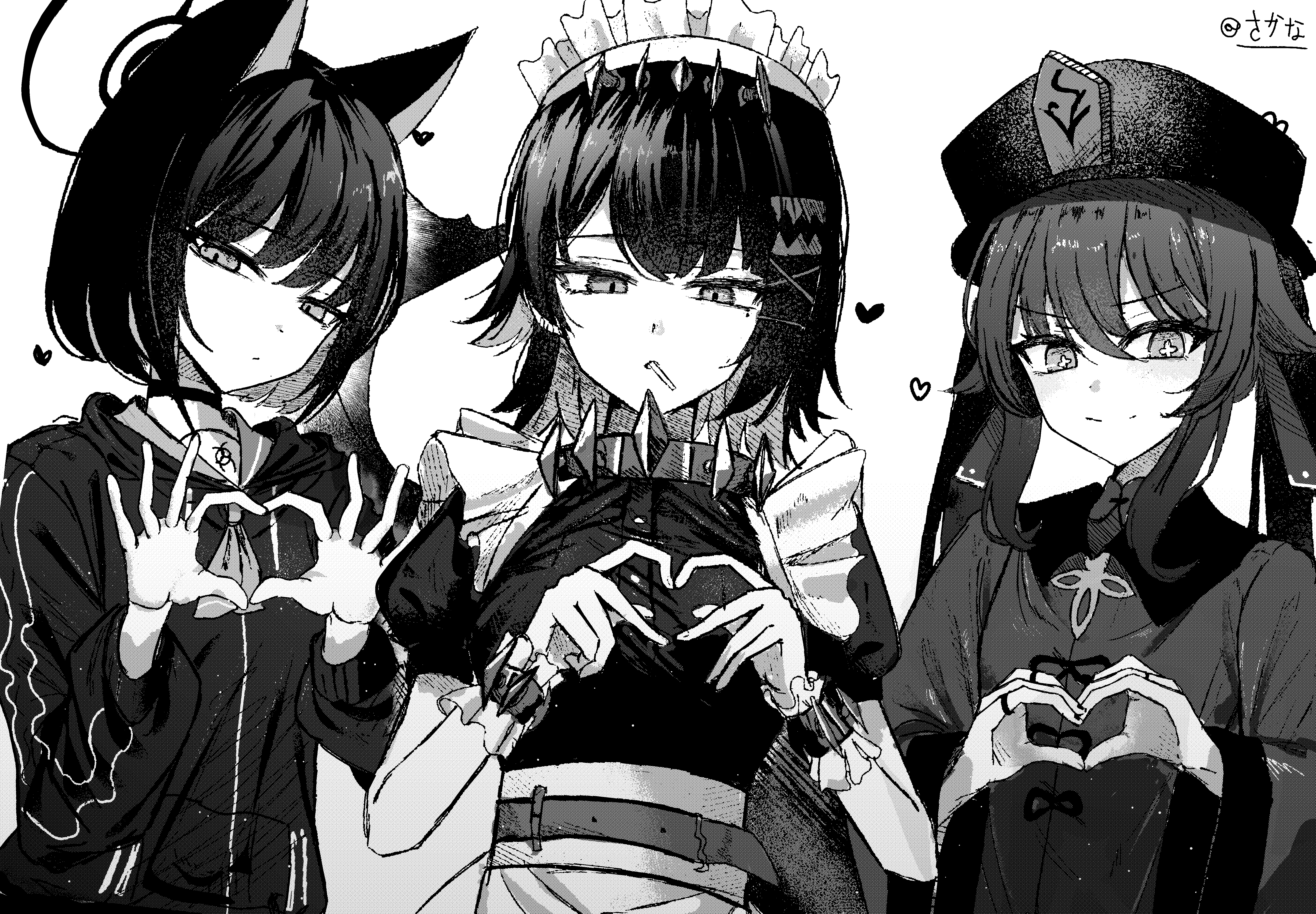 3girls absurdres animal_ears apron blue_archive cat_ears cat_girl dress ellen_joe food_in_mouth four-finger_heart_hands genshin_impact greyscale hair_between_eyes halo hat heart heart_hands highres hu_tao_(genshin_impact) jacket kazusa_(blue_archive) lollipop_in_mouth long_hair looking_at_viewer maid maid_apron maid_headdress monochrome multiple_girls neckerchief sailor_collar sakana_(whhy8883) short_hair zenless_zone_zero
