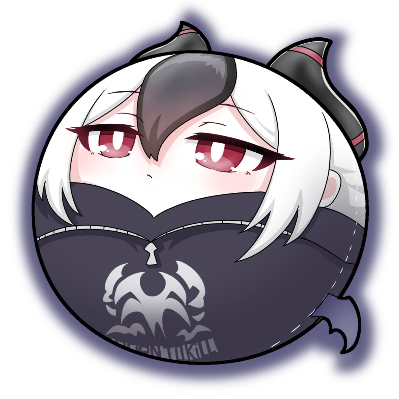 :/ black_hair black_horns blue_archive bright_pupils character_doll commentary_request demon_horns doll highres horns jitome kayoko_(blue_archive) multicolored_hair no_humans red_eyes simple_background souvenir_doll_(blue_archive) stuffed_toy tomimon two-tone_hair white_background white_hair white_pupils zipper zipper_pull_tab