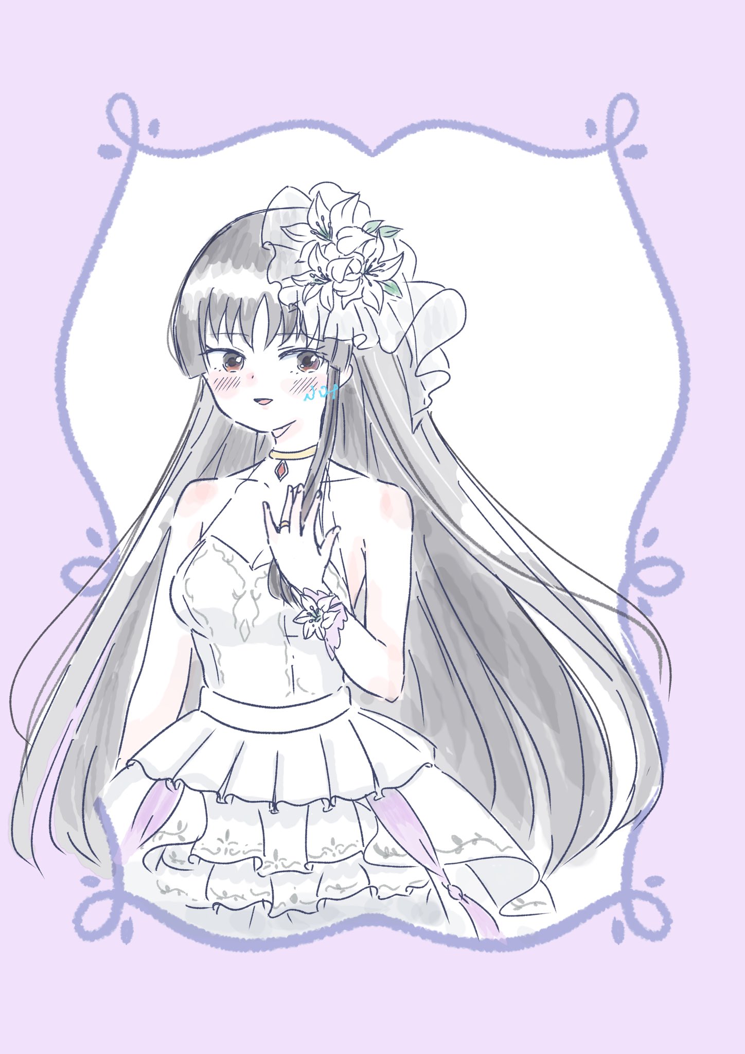 1girl arm_at_side artist_name assault_lily bare_arms bare_shoulders black_hair border breasts bride brown_eyes collarbone commentary cowboy_shot dress flower frilled_dress frills fumi_(fumifumi3axl) hair_flower hair_ornament halter_dress halterneck hand_up highres jewelry lily_(flower) long_hair looking_at_viewer medium_breasts official_alternate_costume outside_border parted_lips pendant purple_border ring see-through_cleavage see-through_clothes shirai_yuyu sleeveless sleeveless_dress smile solo standing tearing_up very_long_hair wedding_dress wedding_ring white_background white_dress white_flower wrist_cuffs wrist_flower
