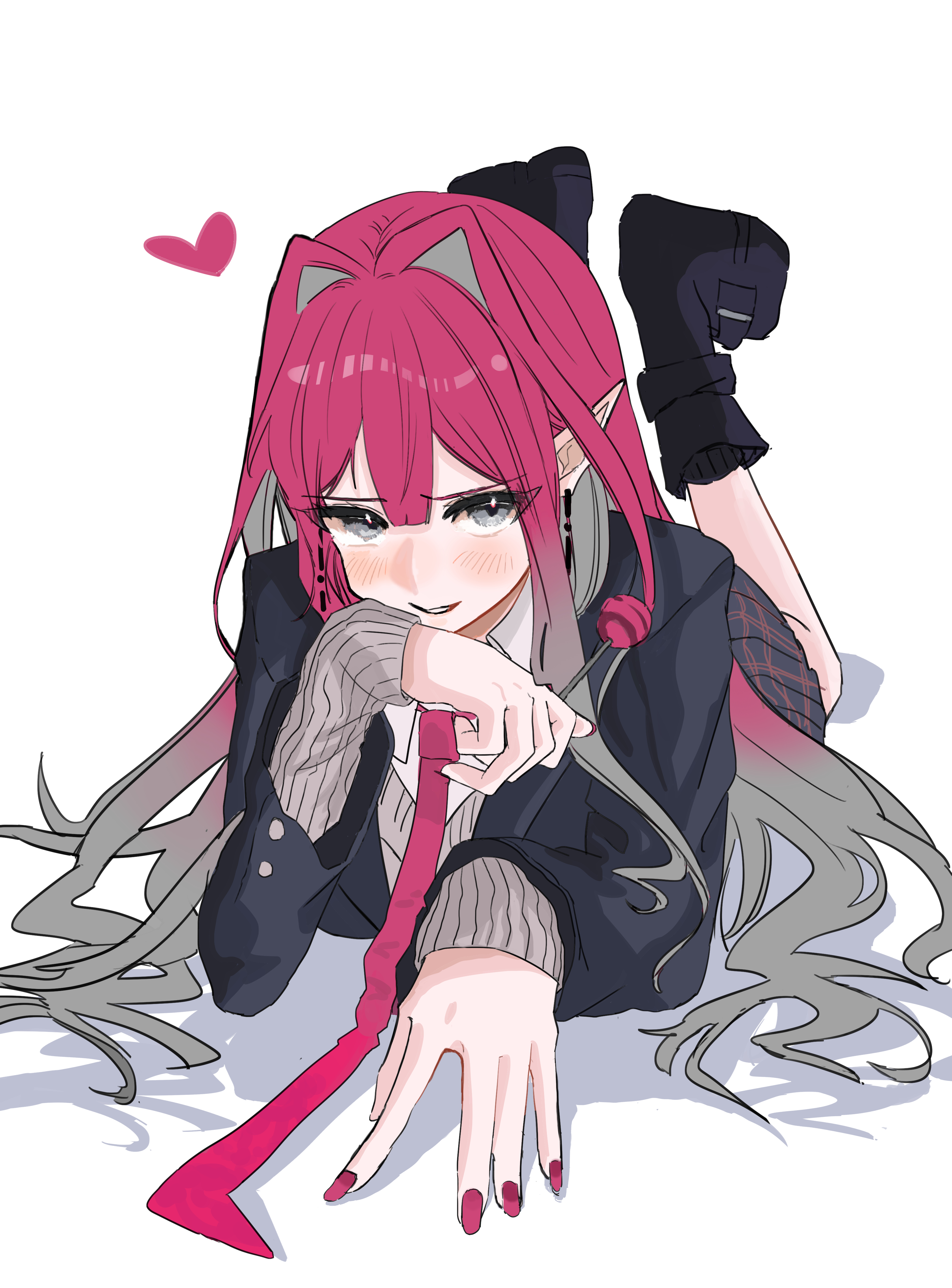 1girl absurdres baobhan_sith_(fate) black_jacket black_shoes blush collared_shirt fate/grand_order fate_(series) grey_eyes grey_hair grin heart highres jacket long_hair looking_at_viewer multicolored_hair necktie official_alternate_costume open_clothes open_jacket pink_necktie school_uniform shadow shirt shoes shou_si_ok simple_background smile solo two-tone_hair white_background white_shirt