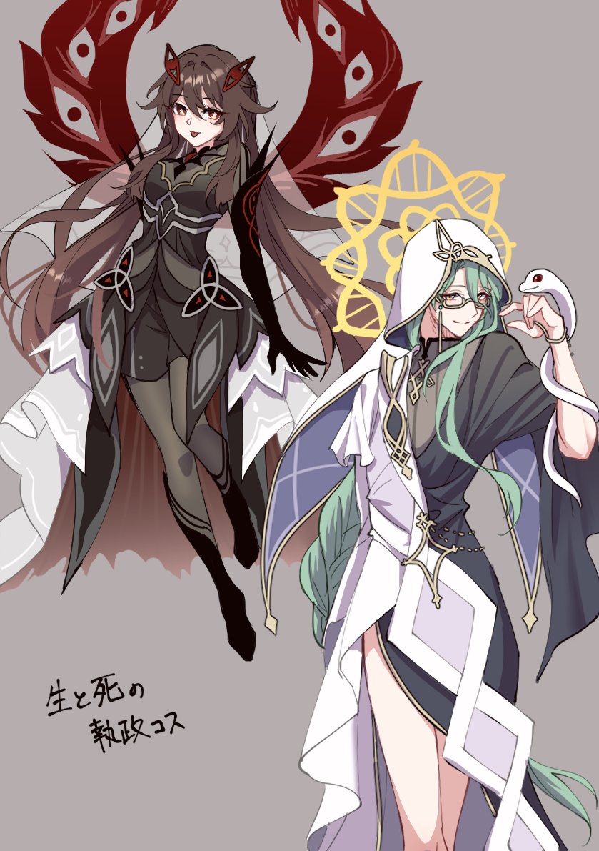 1boy 1girl :p alternate_costume alternate_hairstyle alternate_universe animal_on_arm baizhu_(genshin_impact) black_dress black_skin braid brown_eyes brown_hair changsheng_(genshin_impact) closed_mouth colored_skin commentary_request cosplay crossdressing crossdressing_(mtf) dress eye_symbol floating genshin_impact glasses green_hair grey_background hair_between_eyes hair_intakes hair_ornament hand_up hood hood_up hooded_dress hu_tao_(genshin_impact) light_smile lla_umbre long_braid long_hair looking_at_animal looking_at_viewer looking_down looking_to_the_side multicolored_dress multicolored_skin naberius_(genshin_impact) naberius_(genshin_impact)_(cosplay) powering_up red_eyes red_wings ronova_(genshin_impact) ronova_(genshin_impact)_(cosplay) see-through_clothes see-through_veil short_sleeves side_slit simple_background single_braid skin_tight snake standing symbol-shaped_pupils thighs tongue tongue_out twintails two-tone_dress two-tone_skin veil wavy_hair white_dress white_snake wide_sleeves wings yellow_eyes