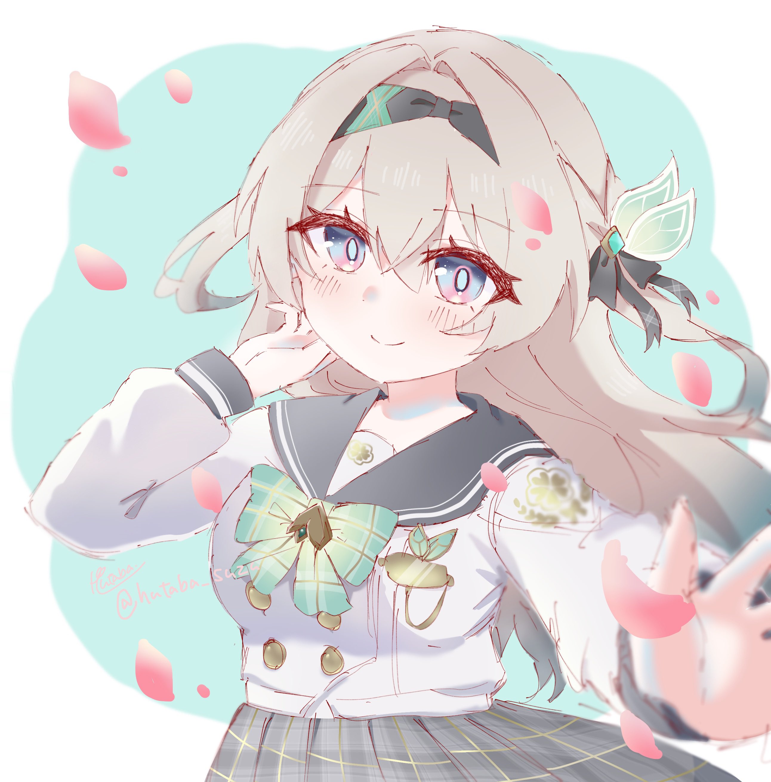 1girl absurdres black_hairband black_ribbon blush bow bowtie buttons closed_mouth double-breasted falling_petals firefly_(honkai:_star_rail) firefly_(spring_missive)_(honkai:_star_rail) frilled_sleeves frills gradient_eyes green_bow green_bowtie green_pupils grey_hair grey_sailor_collar grey_shirt hair_between_eyes hair_intakes hair_ornament hair_ribbon hairband highres honkai:_star_rail honkai_(series) hutaba_suzu long_sleeves multicolored_eyes petals pink_petals plaid_bow plaid_bowtie plaid_clothes pleated_skirt ribbon sailor_collar shirt skirt smile solo