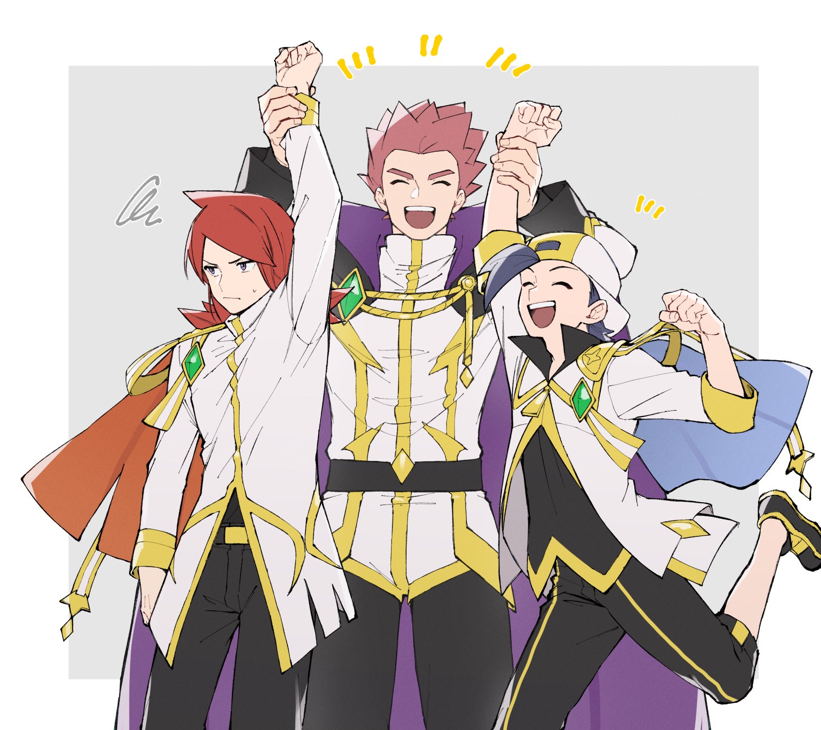 3boys :d arm_up backwards_hat belt_buckle black_pants buckle cape capri_pants closed_eyes commentary_request ethan_(arc_suit)_(pokemon) ethan_(pokemon) gem green_gem hat highres jacket lance_(arc_suit)_(pokemon) lance_(pokemon) leg_up male_focus mocollie multiple_boys nintendo official_alternate_costume open_mouth pants pokemon pokemon_masters_ex red_hair shoes short_hair shout_lines silver_(arc_suit)_(pokemon) silver_(pokemon) smile squiggle teeth upper_teeth_only white_hat white_jacket