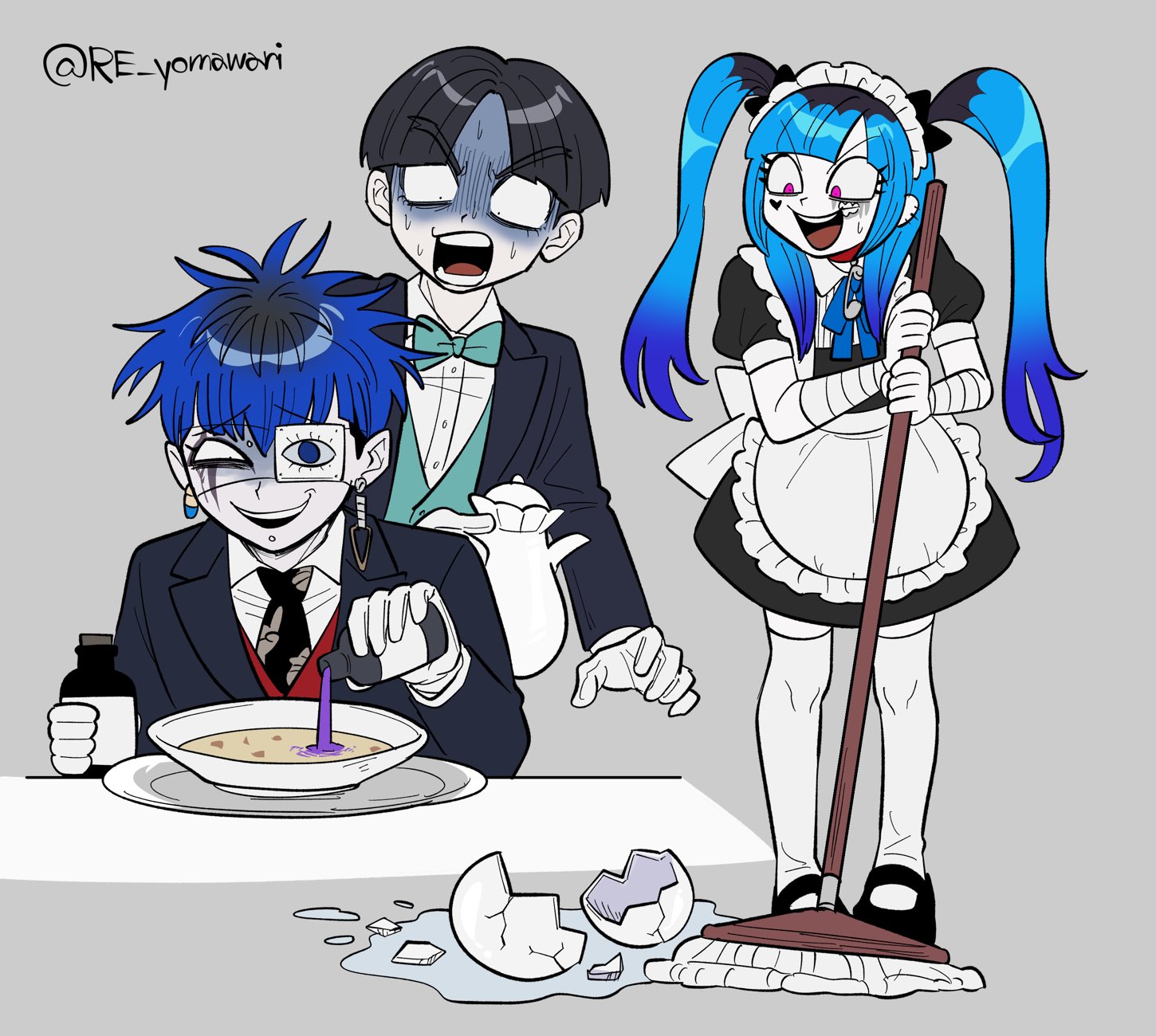 1girl 2boys alternate_costume amemiya_darumi apron black_hair black_jacket black_necktie blue_hair bottle bow bowl bowtie broken_glass butler earrings enmaided eye_print eyepatch face_piercing facial_mark food frills furukawa_(yomawari) glass gloves green_bow green_bowtie green_vest grey_background hair_bow heart heart_facial_mark highres holding holding_bottle holding_mop holding_teapot jacket jewelry labret_piercing long_hair looking_at_another maid maid_apron maid_headdress maruko_gaku mop multicolored_hair multiple_boys necktie nervous_sweating official_alternate_costume omokage_yugamu piercing pink_eyes plate poison print_eyepatch red_vest roots_(hair) safety_pin scared shirt short_hair skirt soup sweat sweatdrop teapot the_hundred_line_-last_defense_academy- thighhighs twintails vest wet_floor white_apron white_gloves white_shirt