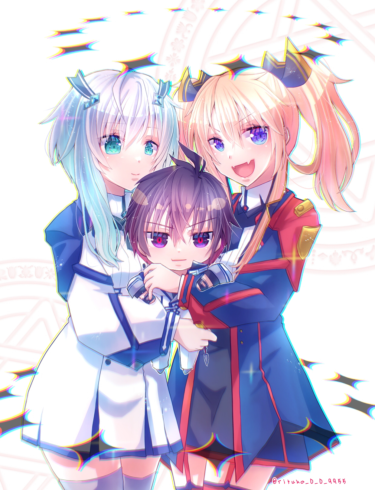 1boy 2girls anos_voldigoad black_hair blonde_hair blue_eyes demon_king_academy_school_uniform green_eyes grey_hair highres maou_gakuin_no_futekigousha misha_necron multiple_girls purple_eyes ribbon ritsuka_(rituka) sasha_necron school_uniform siblings sisters twins