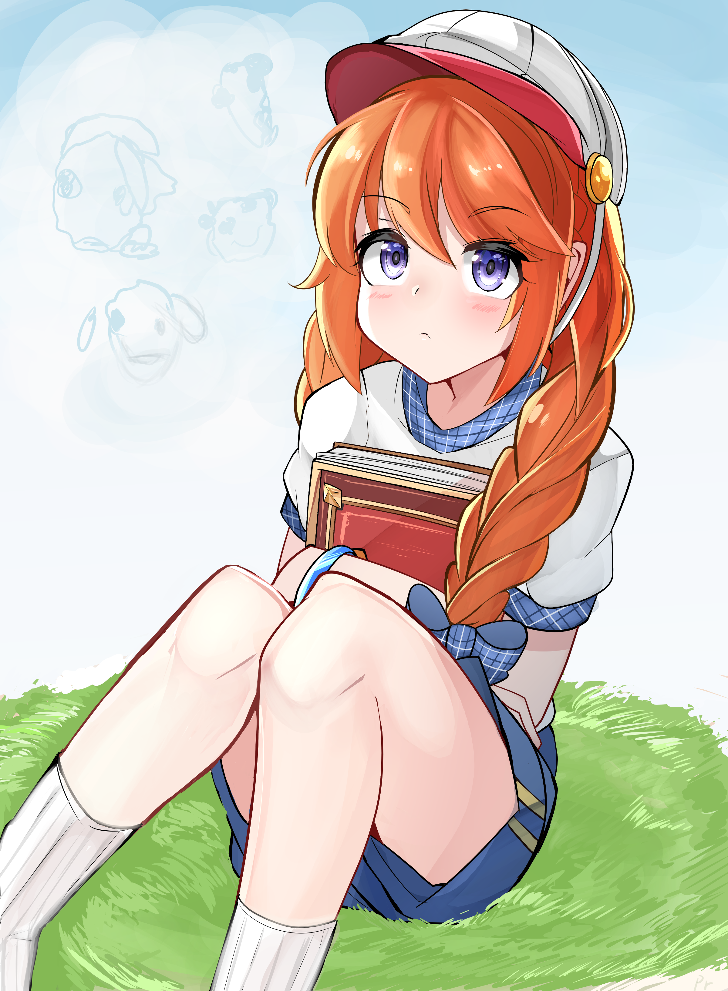 1girl absurdres baseball_cap blue_sky blush book braid closed_mouth commentary_request feet_out_of_frame hair_between_eyes hair_over_shoulder hat highres hugging_object knees_up low_twintails orange_hair princess_connect! purple_eyes ribbed_socks shi_(kamokamo910) sitting sky socks solo twin_braids twintails white_hat white_socks yuni_(princess_connect!) yuni_(school_festival)_(princess_connect!)