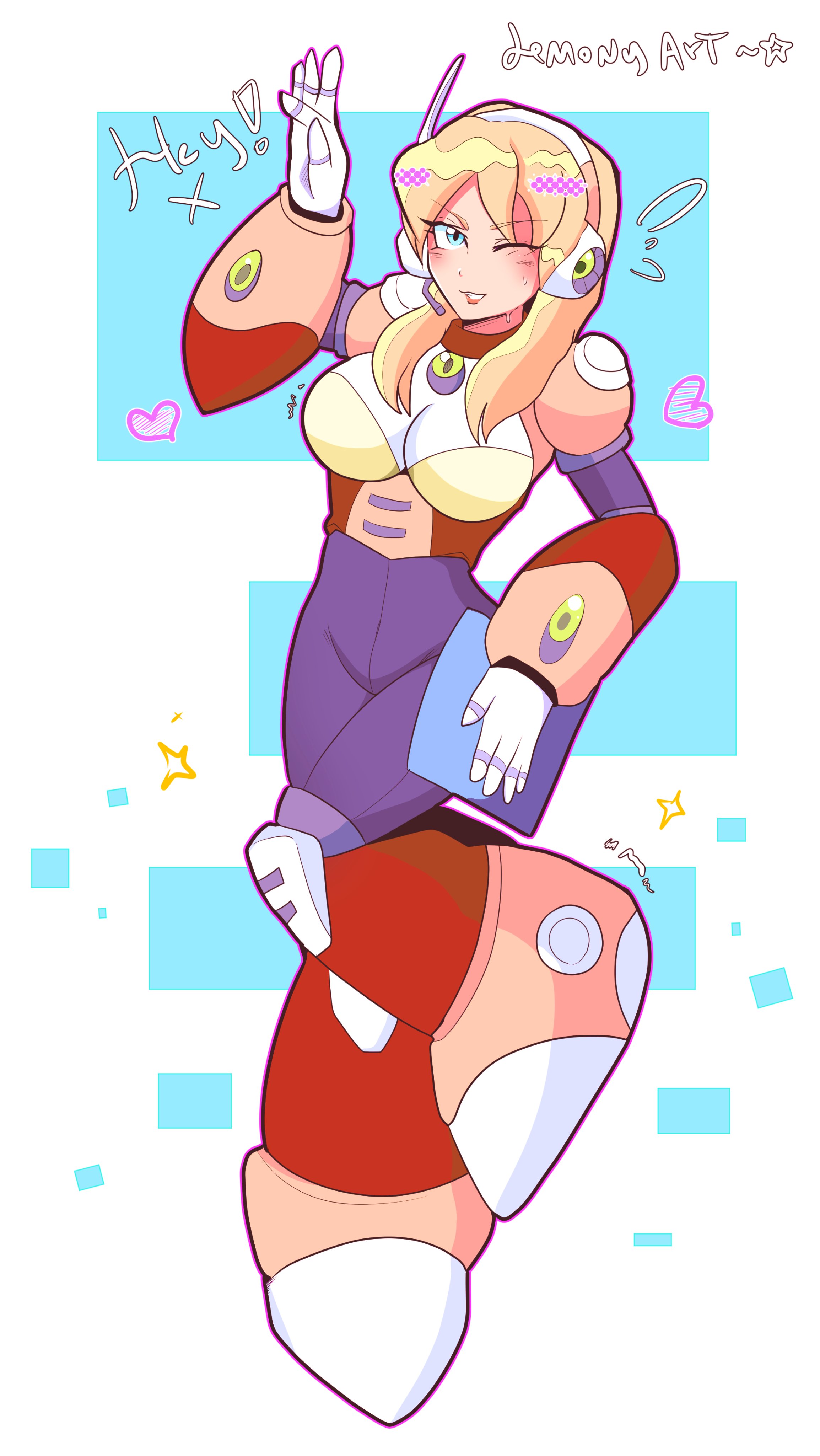 1girl absurdres alia_(mega_man) artlemony blonde_hair blue_eyes breasts full_body highres large_breasts medium_hair mega_man_(series) mega_man_x_(series) one_eye_closed simple_background solo white_background