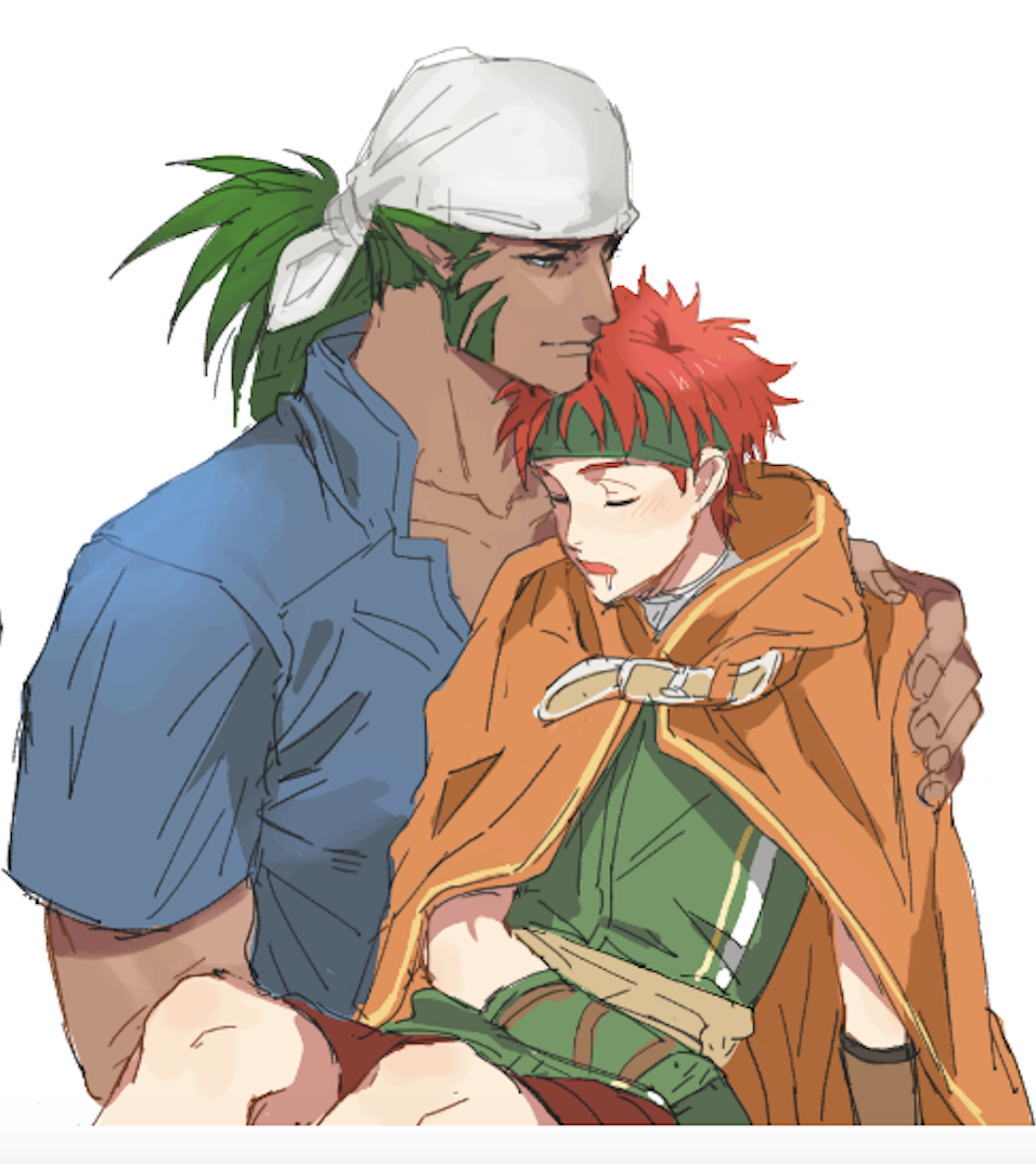 2boys 5_(femfamme) animal_ears bandana carrying carrying_person commentary_request dark-skinned_male dark_skin fire_emblem fire_emblem:_path_of_radiance green_hair headband male_focus muarim_(fire_emblem) multiple_boys nintendo princess_carry red_hair short_hair simple_background sleeping tormod_(fire_emblem) white_background